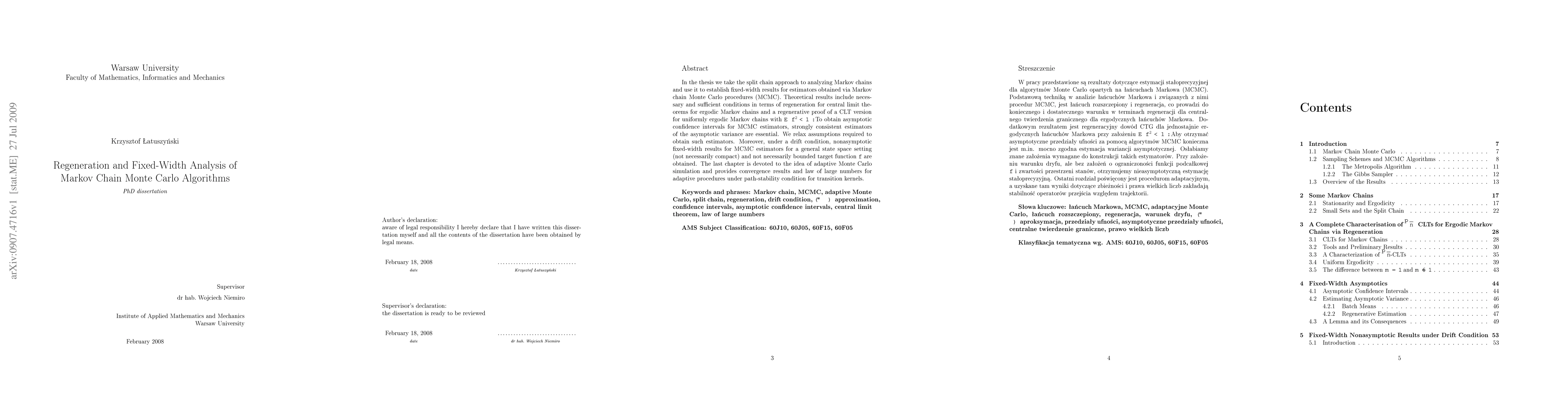 This paper analyzes Markov chain Monte Carlo (MCMC) algorithms using regeneration theory, establishing fixed-width results for MCMC estimators. It provides necessary and sufficient conditions for central limit theorems and relaxes assumptions for obtaining strongly consistent estimators of the asymptotic variance, offering nonasymptotic results under a drift condition.