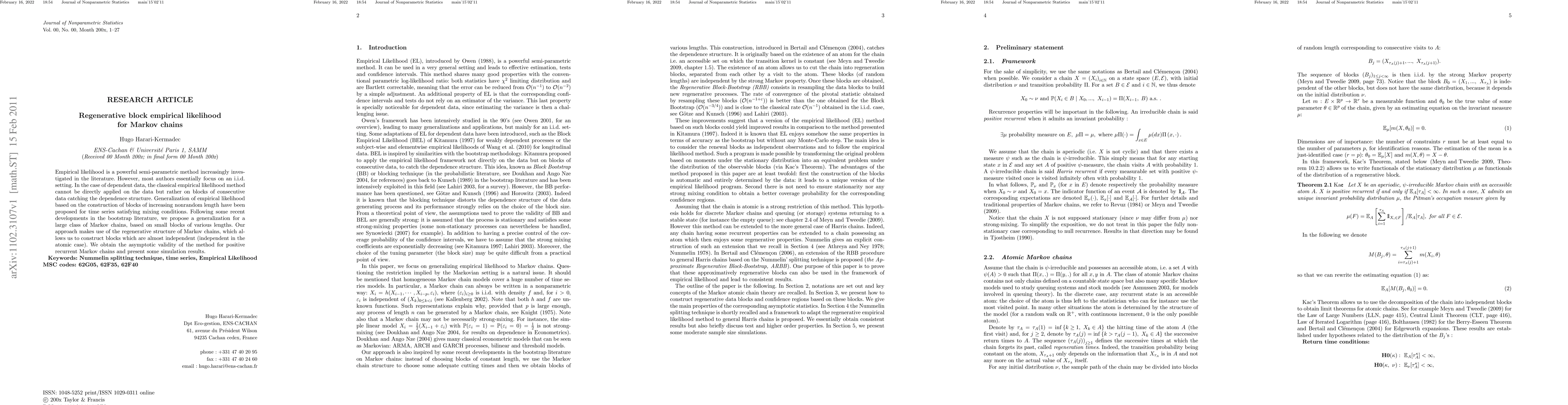 This paper proposes a regenerative block empirical likelihood method for Markov chains, extending classical empirical likelihood to dependent data. The approach leverages the regenerative structure of Markov chains to construct almost independent blocks, ensuring the asymptotic validity for positive recurrent chains, with simulation results demonstrating its effectiveness.