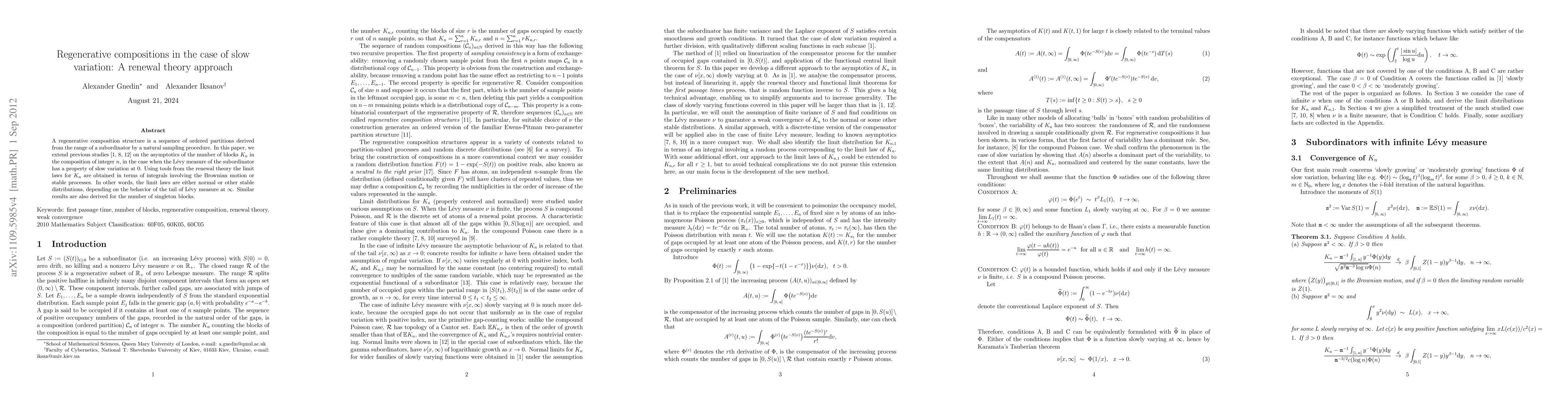 A regenerative composition structure is a sequence of ordered partitions derived from the range of a subordinator by a natural sampling procedure. In this paper, we extend previous studies Barbour and Gnedin (2006), Gnedin, Iksanov and Marynych (2010) and Gnedin, Pitman and Yor (2006) on the asymptotics of the number of blocks $K_n$ in the composition of integer $n$, in the case when the L{\'e}vy measure of the subordinator has a property of slow variation at 0. Using tools from the renewal theory the limit laws for $K_n$ are obtained in terms of integrals involving the Brownian motion or stable processes. In other words, the limit laws are either normal or other stable distributions, depending on the behavior of the tail of L{\'e}vy measure at $\infty$. Similar results are also derived for the number of singleton blocks.