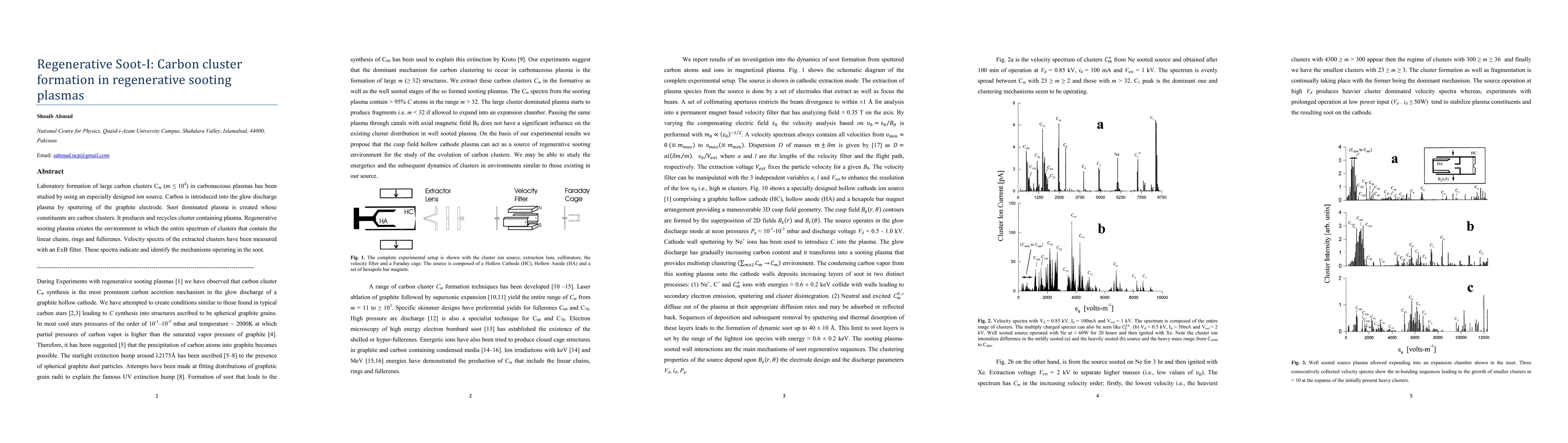 Laboratory formation of large carbon clusters with m C atoms where m could be up to few thousand, in carbonaceous plasma, has been studied by using an especially designed ion source. Carbon is introduced into the glow discharge plasma by sputtering of the graphite electrode. Soot dominated plasma is created whose constituents are carbon clusters. It produces and recycles cluster containing plasma. Regenerative sooting plasma creates the environment in which the entire spectrum of clusters that contain the linear chains, rings and fullerenes. Velocity spectra of the extracted clusters have been measured with an ExB filter. These spectra indicate and identify the mechanisms operating in the soot.