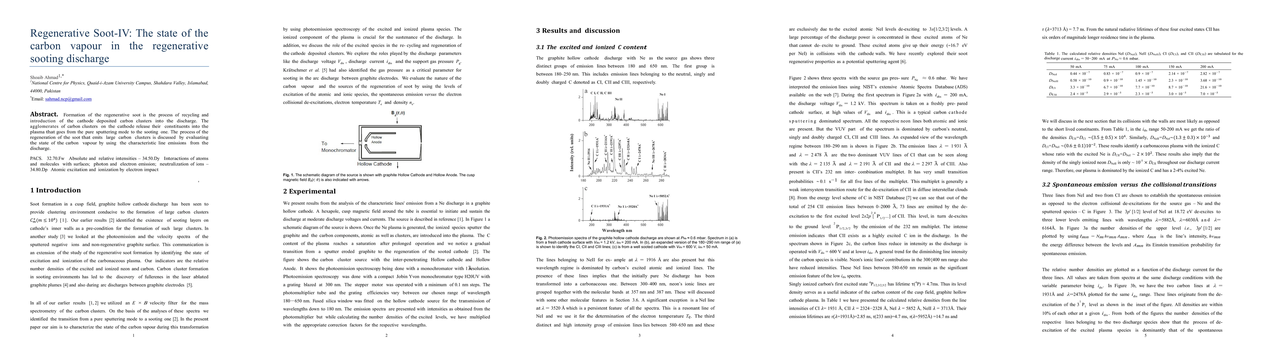This paper investigates the regenerative process of soot formation in carbon vapour within a sooting discharge, focusing on the recycling and release of carbon clusters from the cathode into the plasma, transitioning from sputtering to sooting mode, and evaluates the state of carbon vapour through characteristic line emissions.