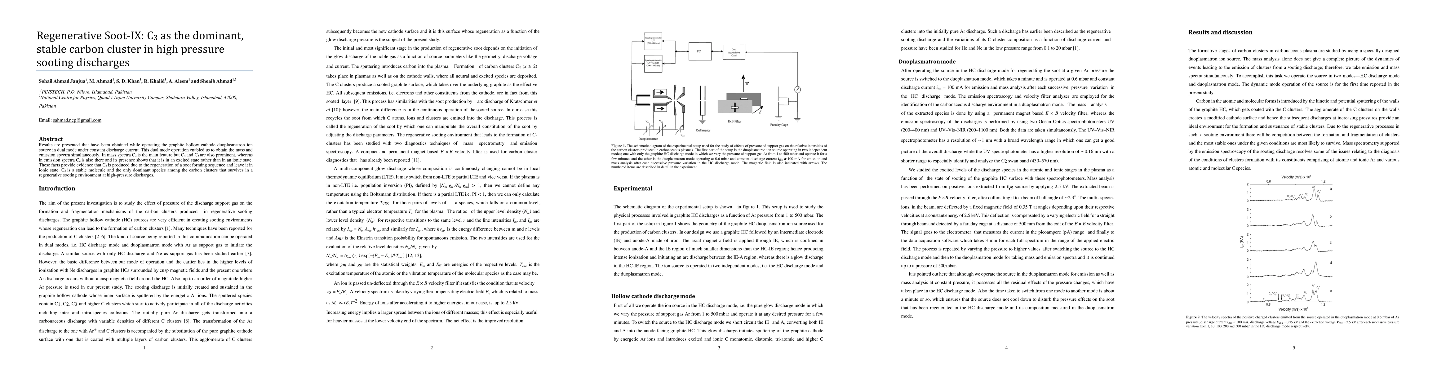 Results are presented that have been obtained while operating the graphite hollow cathode duoplasmatron ion source in dual mode under constant discharge current. This dual mode operation enabled us to obtain the mass and emission spectra simultaneously. In mass spectra C3 is the main feature but C4 and C5 are also prominent, whereas in emission spectra C2 is also there and its presence shows that it is in an excited state rather than in an ionic state. These facts provide evidence that C3 is produced due to the regeneration of a soot forming sequence and leave it in ionic state. C3 is a stable molecule and the only dominant species among the carbon clusters that survives in a regenerative sooting environment at high-pressure discharges.