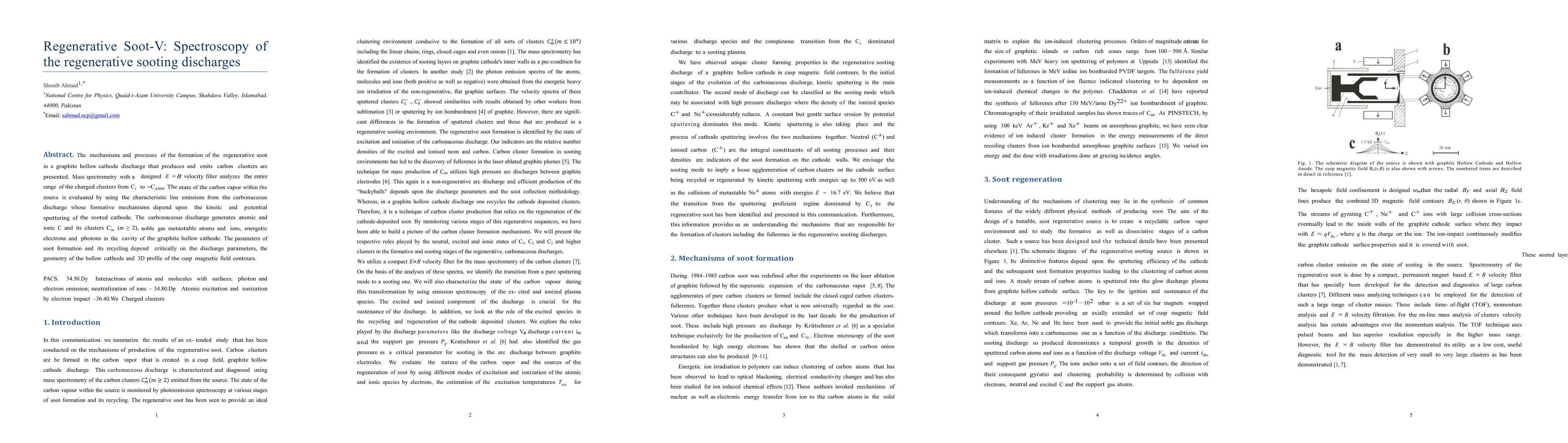 The mechanisms and processes of the formation of the regenerative soot in a graphite hollow cathode discharge that produces and emits carbon clusters are presented. Mass spectrometry with a designed ExB velocity filter analyzes the entire range of the charged clusters from monatomic Carbon C1 to as large clusters as C4300. The state of the carbon vapor within the source is evaluated by using the characteristic line emissions from the carbonaceous discharge whose formative mechanisms depend upon the kinetic and potential sputtering of the sooted cathode. The carbonaceous discharge generates atomic and ionic C and its clusters Cm where m is equal to or greater than 2, noble gas metastable atoms and ions, energetic electrons and photons in the cavity of the graphite hollow cathode. The parameters of soot formation and its recycling depend critically on the discharge parameters, the geometry of the hollow cathode and 3D profile of the cusp magnetic field contours.