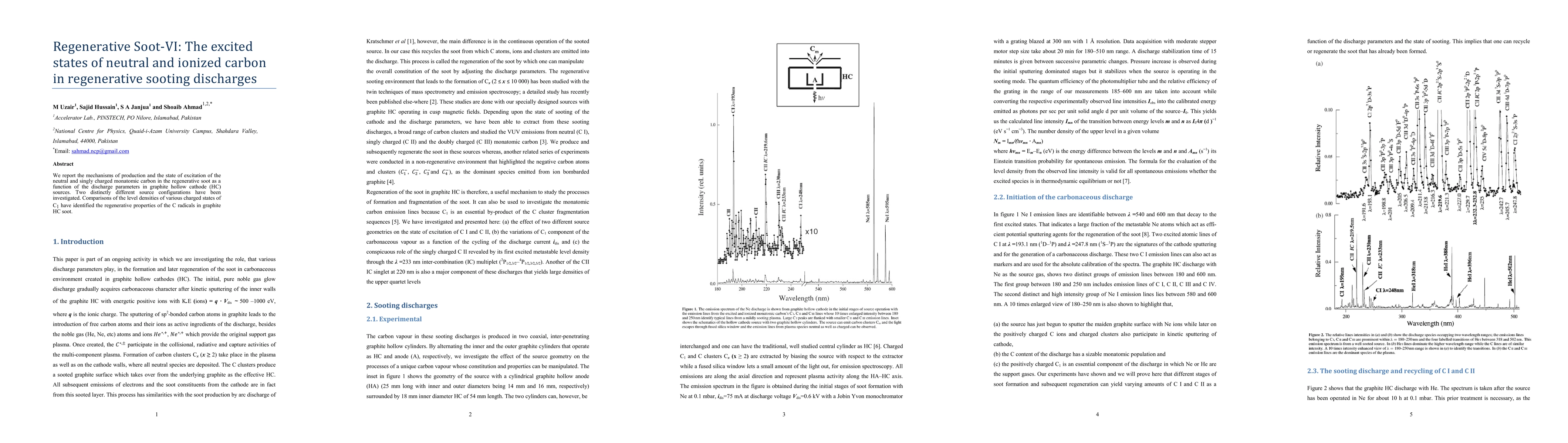This paper investigates the production mechanisms and excitation states of neutral and ionized carbon in regenerative sooting discharges within graphite hollow cathode sources. It identifies distinct configurations and compares the level densities of various charged carbon states to highlight the regenerative properties of carbon radicals in the soot.