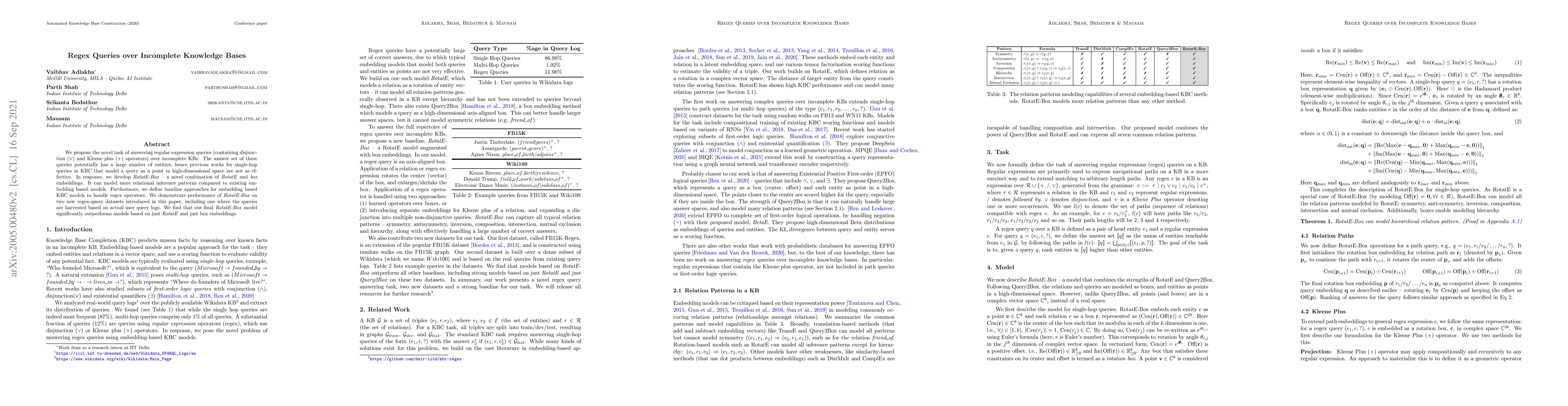 We propose the novel task of answering regular expression queries (containing disjunction ($\vee$) and Kleene plus ($+$) operators) over incomplete KBs. The answer set of these queries potentially has a large number of entities, hence previous works for single-hop queries in KBC that model a query as a point in high-dimensional space are not as effective. In response, we develop RotatE-Box -- a novel combination of RotatE and box embeddings. It can model more relational inference patterns compared to existing embedding based models. Furthermore, we define baseline approaches for embedding based KBC models to handle regex operators. We demonstrate performance of RotatE-Box on two new regex-query datasets introduced in this paper, including one where the queries are harvested based on actual user query logs. We find that our final RotatE-Box model significantly outperforms models based on just RotatE and just box embeddings.