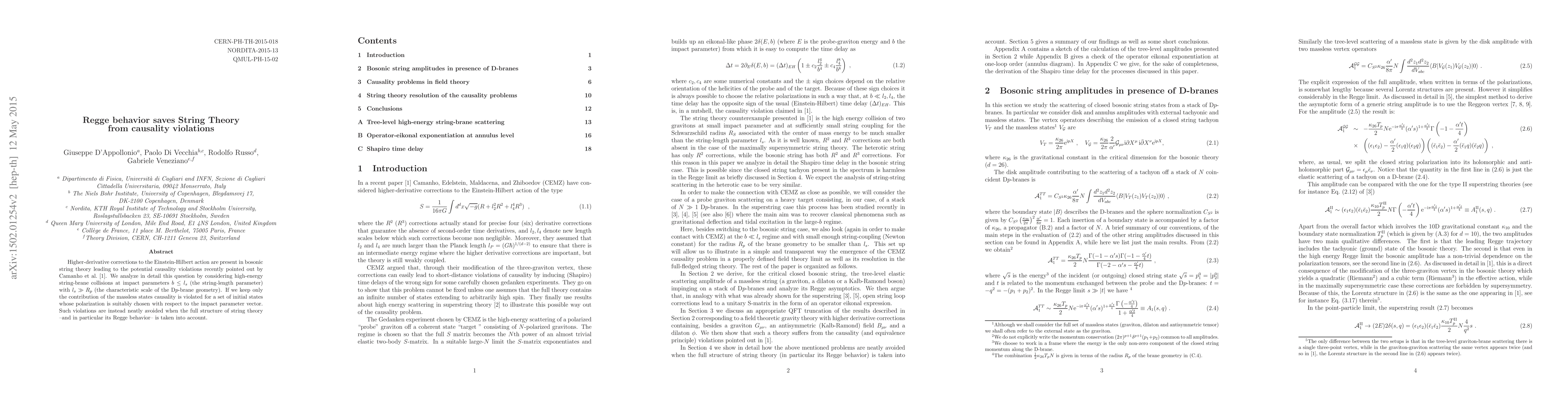 Higher-derivative corrections to the Einstein-Hilbert action are present in bosonic string theory leading to the potential causality violations recently pointed out by Camanho et al. We analyze in detail this question by considering high-energy string-brane collisions at impact parameters $b \le l_s$ (the string-length parameter) with $l_s \gg R_p$ (the characteristic scale of the D$p$-brane geometry). If we keep only the contribution of the massless states causality is violated for a set of initial states whose polarization is suitably chosen with respect to the impact parameter vector. Such violations are instead neatly avoided when the full structure of string theory - and in particular its Regge behavior - is taken into account.