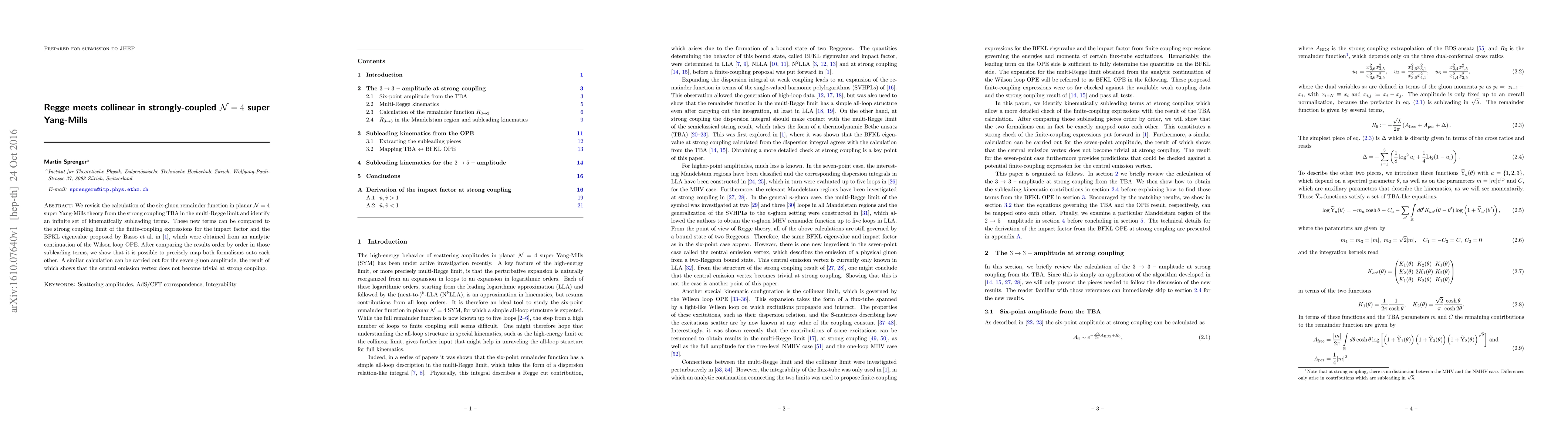 We revisit the calculation of the six-gluon remainder function in planar $\mathcal{N} = 4$ super Yang-Mills theory from the strong coupling TBA in the multi-Regge limit and identify an infinite set of kinematically subleading terms. These new terms can be compared to the strong coupling limit of the finite-coupling expressions for the impact factor and the BFKL eigenvalue proposed by Basso et al. in arXiv:1407.3766, which were obtained from an analytic continuation of the Wilson loop OPE. After comparing the results order by order in those subleading terms, we show that it is possible to precisely map both formalisms onto each other. A similar calculation can be carried out for the seven-gluon amplitude, the result of which shows that the central emission vertex does not become trivial at strong coupling.
