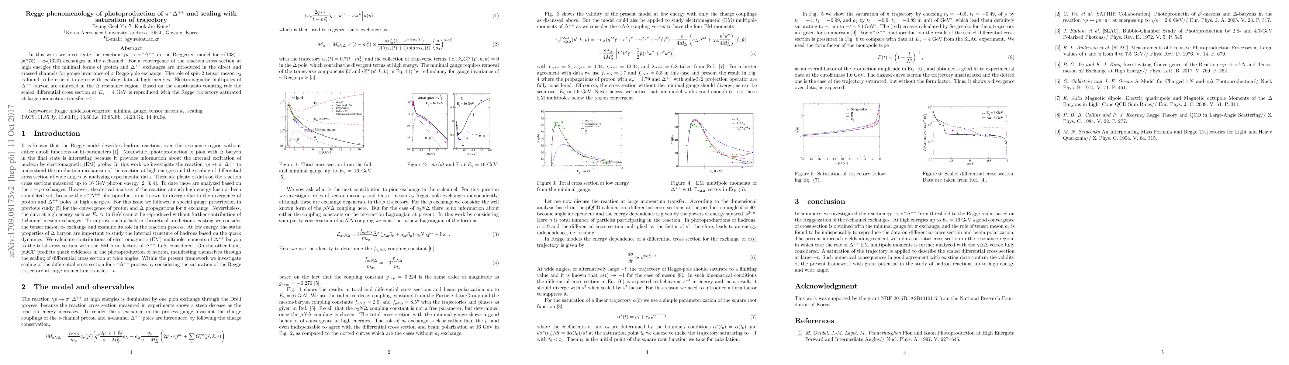 This paper explores the $\gamma p \to \pi^-\Delta^{++}$ reaction using a Reggeized model with $\pi$, $\rho$, and $a_2$ meson exchanges, emphasizing the importance of $a_2$ for high-energy data agreement. It also examines the electromagnetic multipoles of $\Delta^{++}$ and demonstrates scaling and saturation of the Regge trajectory in the differential cross section at 4 GeV.