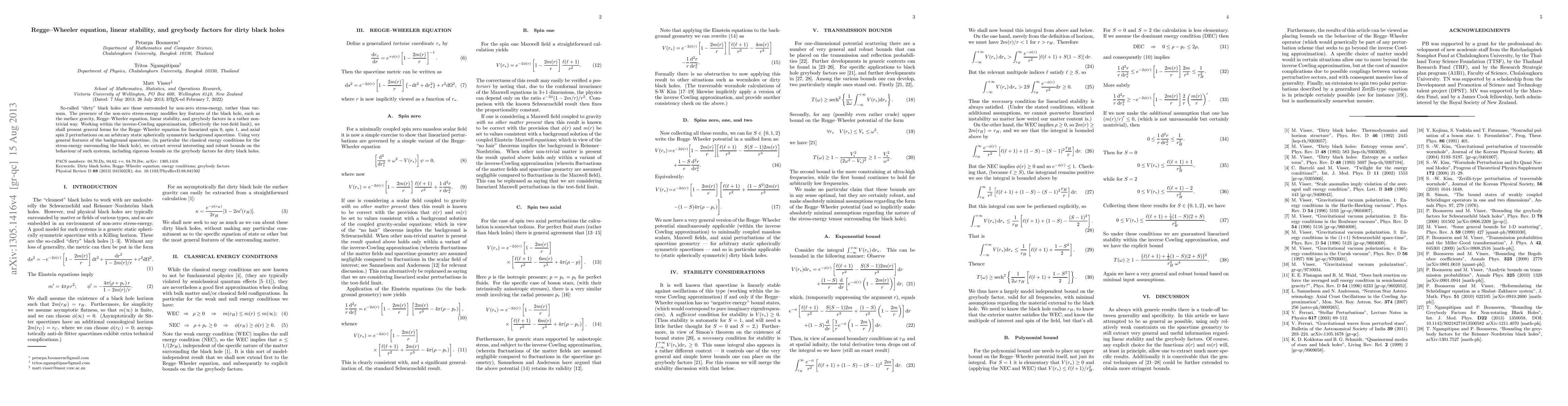 This research derives general forms of the Regge-Wheeler equation for linearized spin 0, spin 1, and axial spin 2 perturbations around arbitrary static spherically symmetric backgrounds, considering 'dirty' black holes with non-zero surrounding stress-energy. Utilizing energy conditions, it establishes bounds on greybody factors and linear stability, offering insights into how non-vacuum surroundings affect black hole properties.