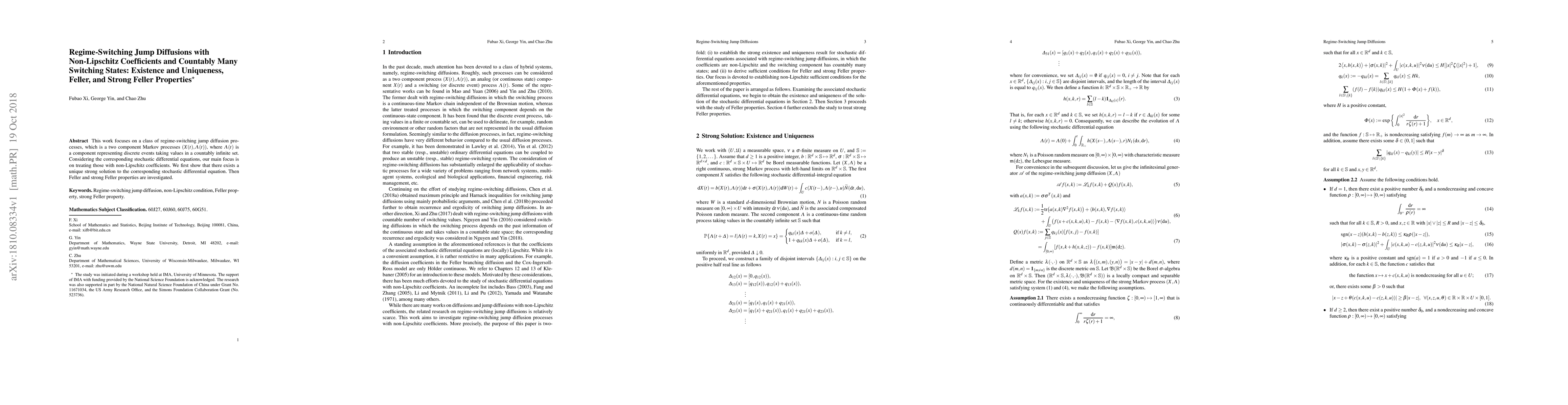 Summary: This paper investigates regime-switching jump diffusion processes with non-Lipschitz coefficients and countably many discrete states, proving the existence and uniqueness of a strong solution, and establishing Feller and strong Feller properties for the process.