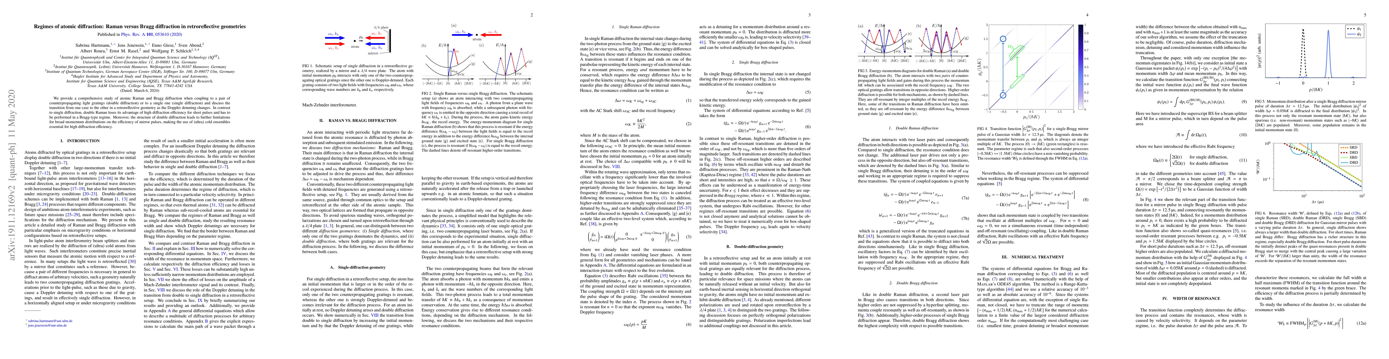 This paper investigates atomic Raman and Bragg diffraction in retroreflective geometries, comparing double diffraction with single diffraction. It finds that double diffraction loses its efficiency advantage for short pulses and requires a Bragg-type regime, while the use of (ultra) cold atomic ensembles is essential for high diffraction efficiency due to limitations in broad momentum distributions.