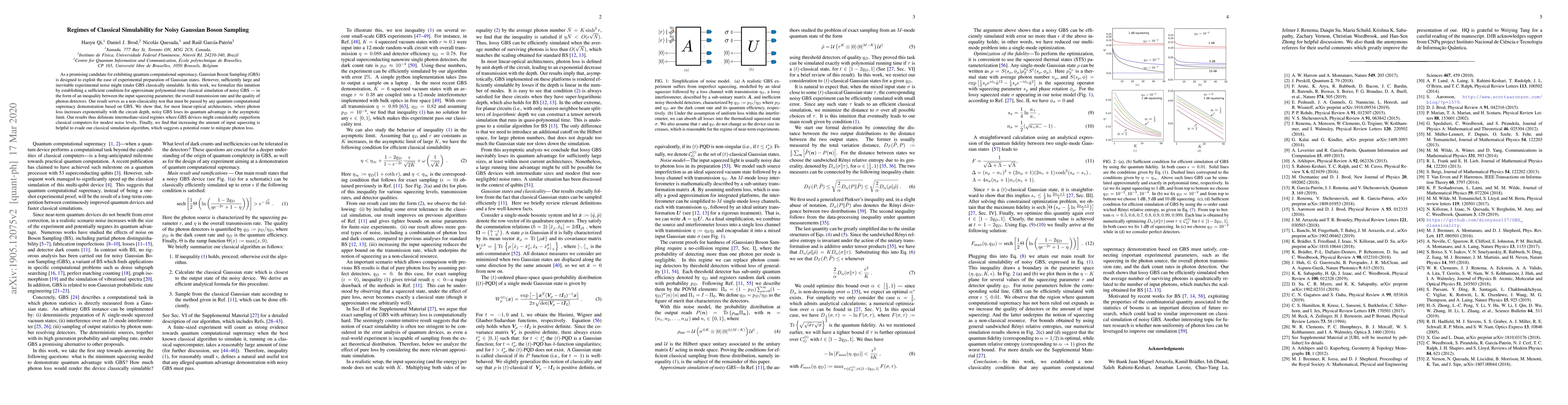 This paper establishes a condition for classical simulation of noisy Gaussian Boson Sampling (GBS), identifying regimes where GBS retains quantum computational supremacy despite noise. It finds that photon loss in linear-optical architectures diminishes GBS's quantum advantage asymptotically, but suggests that increasing input squeezing can help evade classical simulation.
