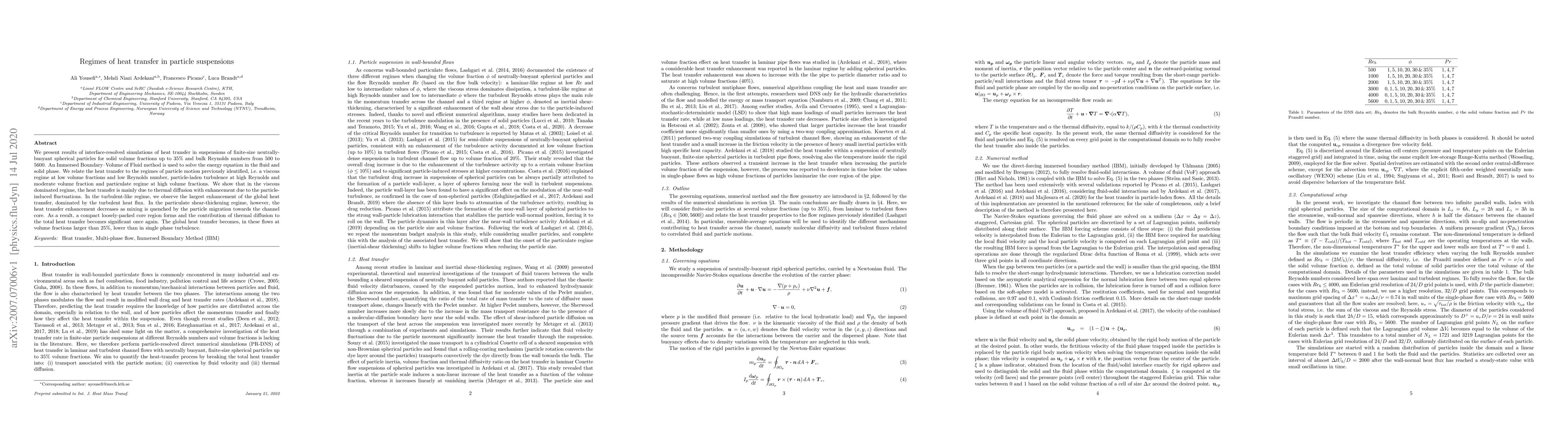 This study uses simulations to analyze heat transfer in particle suspensions, revealing distinct regimes based on particle motion and volume fractions. The largest heat transfer enhancement occurs in turbulent-like regimes, while particulate shear-thickening regimes show reduced heat transfer due to particle migration and reduced mixing.