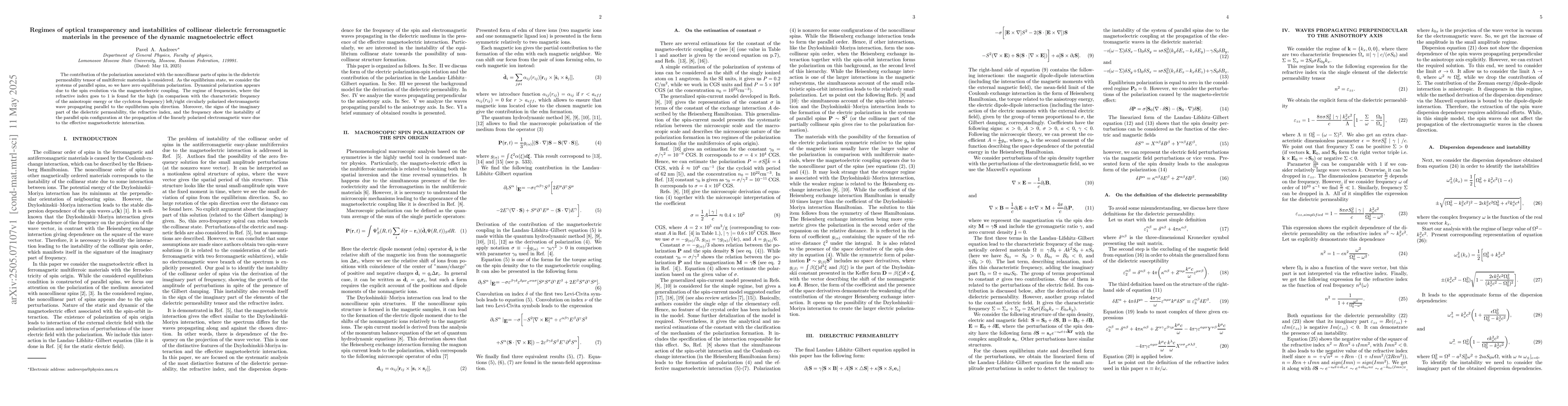 The research considers the contribution of noncollinear spin parts to dielectric permeability in multiferroic materials, focusing on parallel spin systems with zero equilibrium polarization and analyzing dynamical polarization via magnetoelectric coupling.