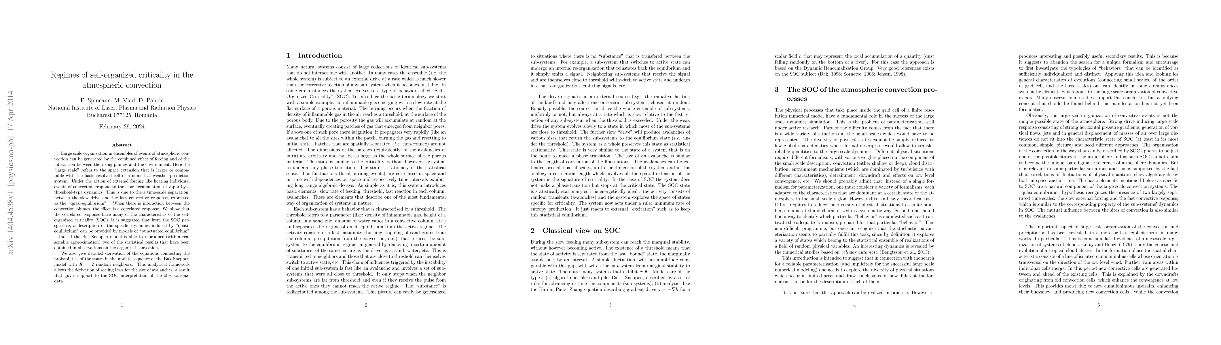 Large scale organization in ensembles of events of atmospheric convection can be generated by the combined effect of forcing and of the interaction between the raising plumes and the environment. Here the "large scale" refers to the space extension that is larger or comparable with the basic resolved cell of a numerical weather prediction system. Under the action of external forcing like heating individual events of convection respond to the slow accumulation of vapor by a threshold-type dynamics. This is due to the a time-scale separation, between the slow drive and the fast convective response, expressed as the "quasi-equilibrium". When there is interaction between the convection plumes, the effect is a correlated response. We show that the correlated response have many of the characteristics of the self-organized criticality (SOC). It is suggested that from the SOC perspective, a description of the specific dynamics induced by "quasi-equilibrium" can be provided by models of "punctuated equilibrium". Indeed the Bak-Sneppen model is able to reproduce (within reasonable approximation) two of the statistical results that have been obtained in observations on the organized convection. We also give detailed derivation of the equations connecting the probabilities of the states in the update sequence of the Bak-Sneppen model with $K=2$ random neighbors. This analytical framework allows the derivation of scaling laws for the size of avalanches, a result that gives support to the SOC interpretation of the observational data.