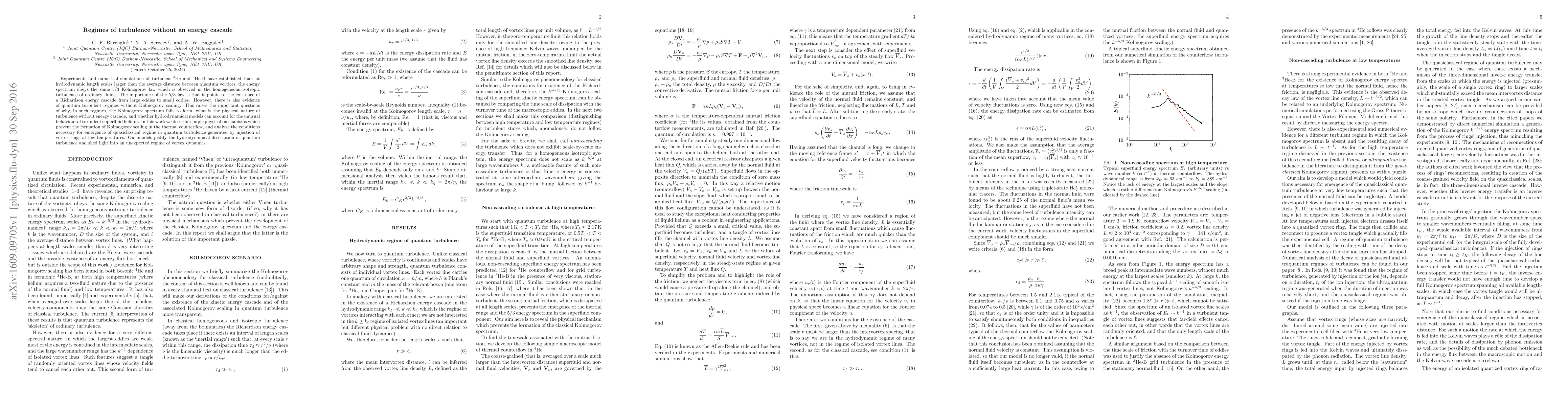 Experiments and numerical simulations of turbulent $^4$He and $^3$He-B have established that, at hydrodynamic length scales larger than the average distance between quantum vortices, the energy spectrum obeys the same 5/3 Kolmogorov law which is observed in the homogeneous isotropic turbulence of ordinary fluids. The importance of the 5/3 law is that it points to the existence of a Richardson energy cascade from large eddies to small eddies. However, there is also evidence of quantum turbulent regimes without Kolmogorov scaling. This raises the important questions of why, in such regimes, the Kolmogorov spectrum fails to form, what is the physical nature of turbulence without energy cascade, and whether hydrodynamical models can account for the unusual behaviour of turbulent superfluid helium. In this work we describe simple physical mechanisms which prevent the formation of Kolmogorov scaling in the thermal counterflow, and analyze the conditions necessary for emergence of quasiclassical regime in quantum turbulence generated by injection of vortex rings at low temperatures. Our models justify the hydrodynamical description of quantum turbulence and shed light into an unexpected regime of vortex dynamics.