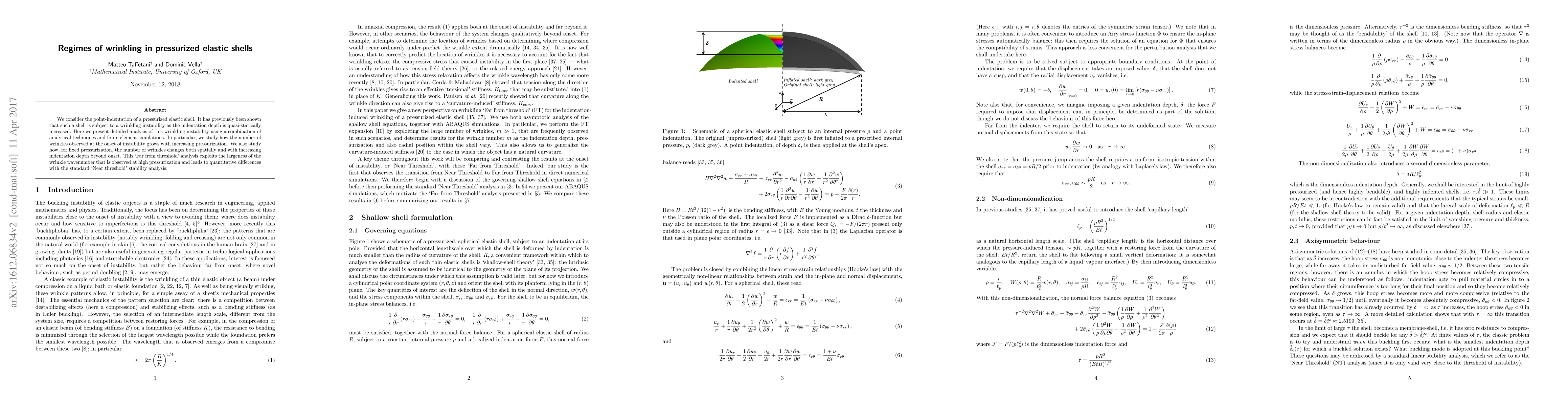 This paper investigates the wrinkling instability in pressurized elastic shells under point-indentation, utilizing analytical methods and simulations. It reveals that the number of wrinkles increases with both pressurization and indentation depth, showing distinct behaviors "far from threshold" compared to standard "near threshold" stability analysis due to the large wrinkle wavenumber at high pressurization.