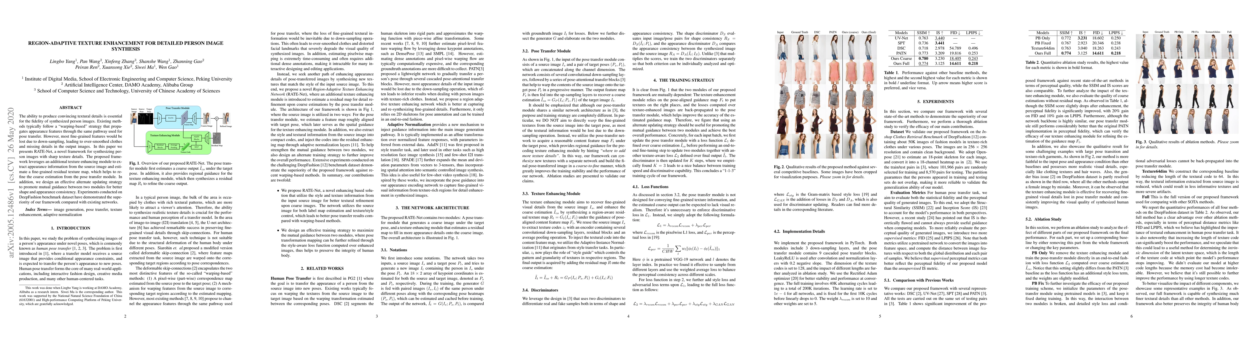 The ability to produce convincing textural details is essential for the fidelity of synthesized person images. However, existing methods typically follow a ``warping-based'' strategy that propagates appearance features through the same pathway used for pose transfer. However, most fine-grained features would be lost due to down-sampling, leading to over-smoothed clothes and missing details in the output images. In this paper we presents RATE-Net, a novel framework for synthesizing person images with sharp texture details. The proposed framework leverages an additional texture enhancing module to extract appearance information from the source image and estimate a fine-grained residual texture map, which helps to refine the coarse estimation from the pose transfer module. In addition, we design an effective alternate updating strategy to promote mutual guidance between two modules for better shape and appearance consistency. Experiments conducted on DeepFashion benchmark dataset have demonstrated the superiority of our framework compared with existing networks.
