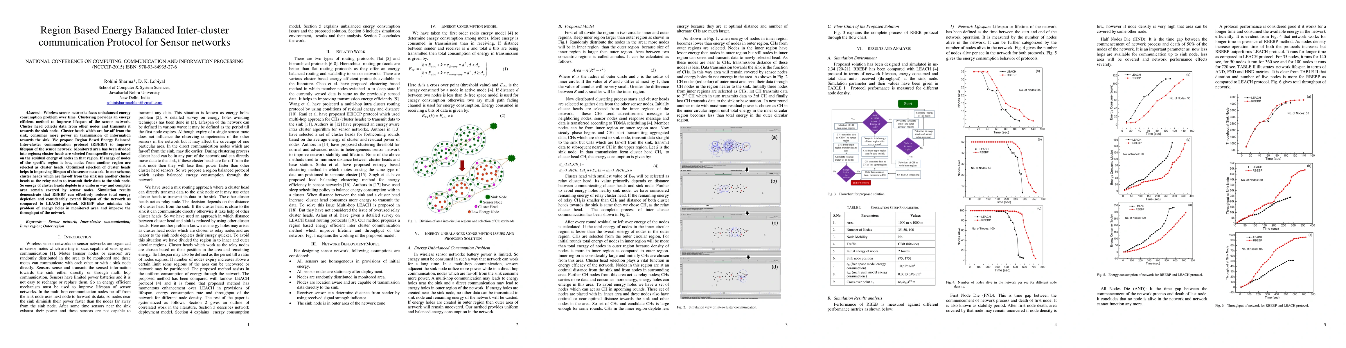 Wireless sensor networks faces unbalanced energy consumption problem over time. Clustering provides an energy efficient method to improve lifespan of the sensor network. Cluster head collects data from other nodes and transmits it towards the sink node. Cluster heads which are far-off from the sink, consumes more power in transmission of information towards the sink. We propose Region Based Energy Balanced Inter-cluster communication protocol (RBEBP) to improve lifespan of the sensor network. Monitored area has been divided into regions; cluster heads are selected from specific region based on the residual energy of nodes in that region. If energy of nodes of the specific region is low, nodes from another region are selected as cluster heads. Optimized selection of cluster heads helps in improving lifespan of the sensor network. In our scheme, cluster heads which are far-off from the sink use another cluster heads as the relay nodes to transmit their data to the sink node. So energy of cluster heads deplete in a uniform way and complete area remain covered by sensor nodes. Simulation results demonstrate that RBEBP can effectively reduce total energy depletion and considerably extend lifespan of the network as compared to LEACH protocol. RBEBP also minimize the problem of energy holes in monitored area and improve the throughput of the network