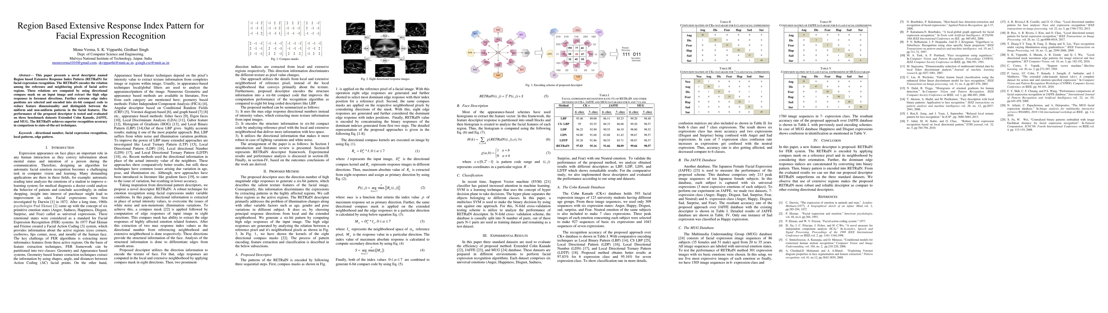 This paper presents a novel descriptor named Region based Extensive Response Index Pattern (RETRaIN) for facial expression recognition. The RETRaIN encodes the relation among the reference and neighboring pixels of facial active regions. These relations are computed by using directional compass mask on an input image and extract the high edge responses in foremost directions. Further extreme edge index positions are selected and encoded into six-bit compact code to reduce feature dimensionality and distinguish between the uniform and non-uniform patterns in the facial features. The performance of the proposed descriptor is tested and evaluated on three benchmark datasets Extended Cohn Kanade, JAFFE, and MUG. The RETRaIN achieves superior recognition accuracy in comparison to state-of-the-art techniques.