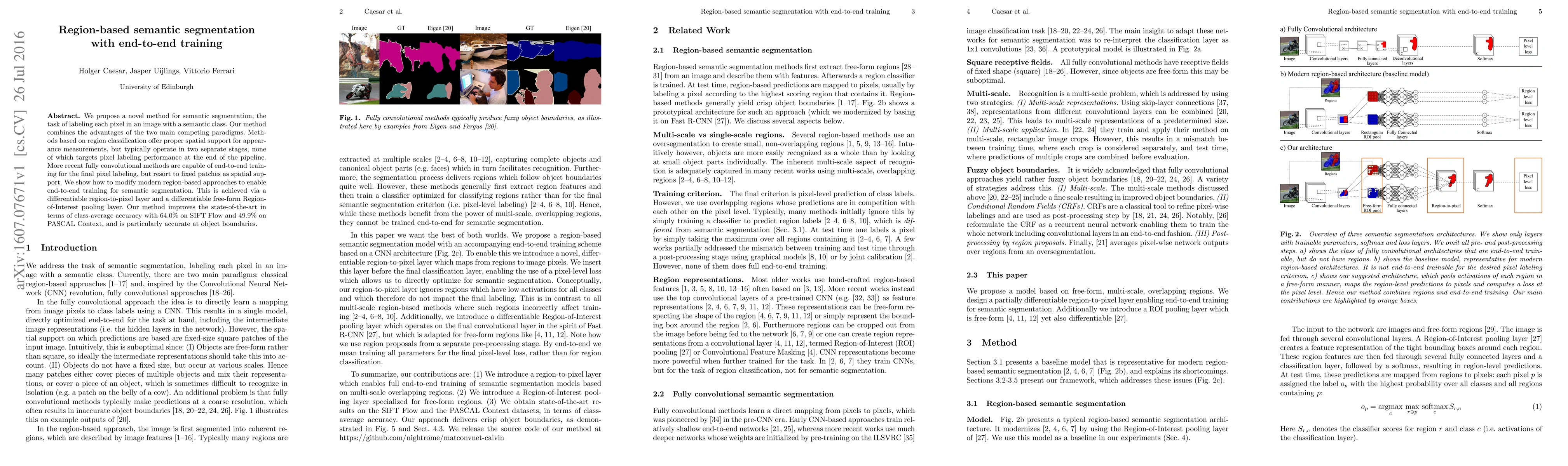This paper proposes a novel region-based semantic segmentation method that combines region classification with end-to-end training, utilizing differentiable region-to-pixel and Region-of-Interest pooling layers, achieving state-of-the-art performance on SIFT Flow and PASCAL Context datasets.