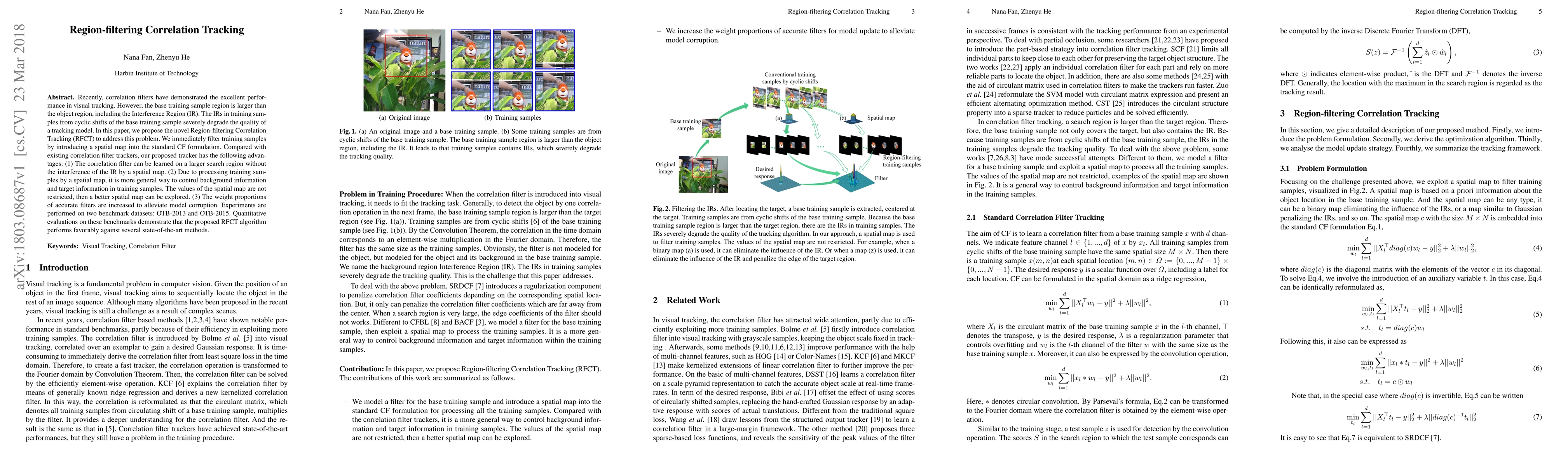 Recently, correlation filters have demonstrated the excellent performance in visual tracking. However, the base training sample region is larger than the object region,including the Interference Region(IR). The IRs in training samples from cyclic shifts of the base training sample severely degrade the quality of a tracking model. In this paper, we propose the novel Region-filtering Correlation Tracking (RFCT) to address this problem. We immediately filter training samples by introducing a spatial map into the standard CF formulation. Compared with existing correlation filter trackers, our proposed tracker has the following advantages: (1) The correlation filter can be learned on a larger search region without the interference of the IR by a spatial map. (2) Due to processing training samples by a spatial map, it is more general way to control background information and target information in training samples. The values of the spatial map are not restricted, then a better spatial map can be explored. (3) The weight proportions of accurate filters are increased to alleviate model corruption. Experiments are performed on two benchmark datasets: OTB-2013 and OTB-2015. Quantitative evaluations on these benchmarks demonstrate that the proposed RFCT algorithm performs favorably against several state-of-the-art methods.
