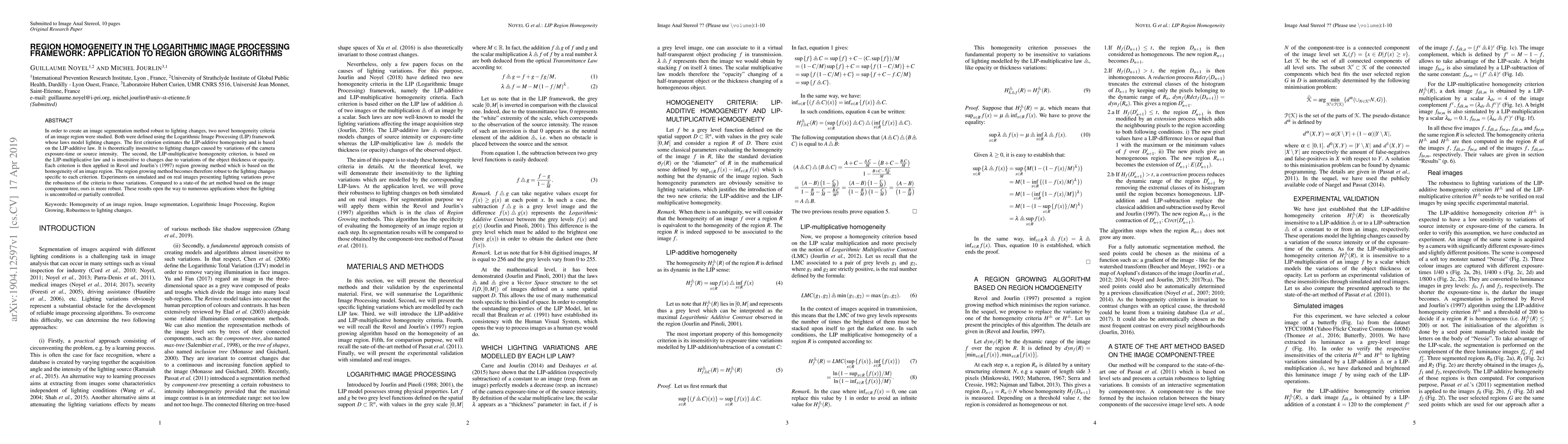 This paper proposes two novel homogeneity criteria within the Logarithmic Image Processing (LIP) framework to enhance region growing algorithms for image segmentation, making them robust to lighting changes. The criteria, based on LIP-additive and LIP-multiplicative laws, are tested in region growing methods and shown to outperform a state-of-the-art method in handling lighting variations.