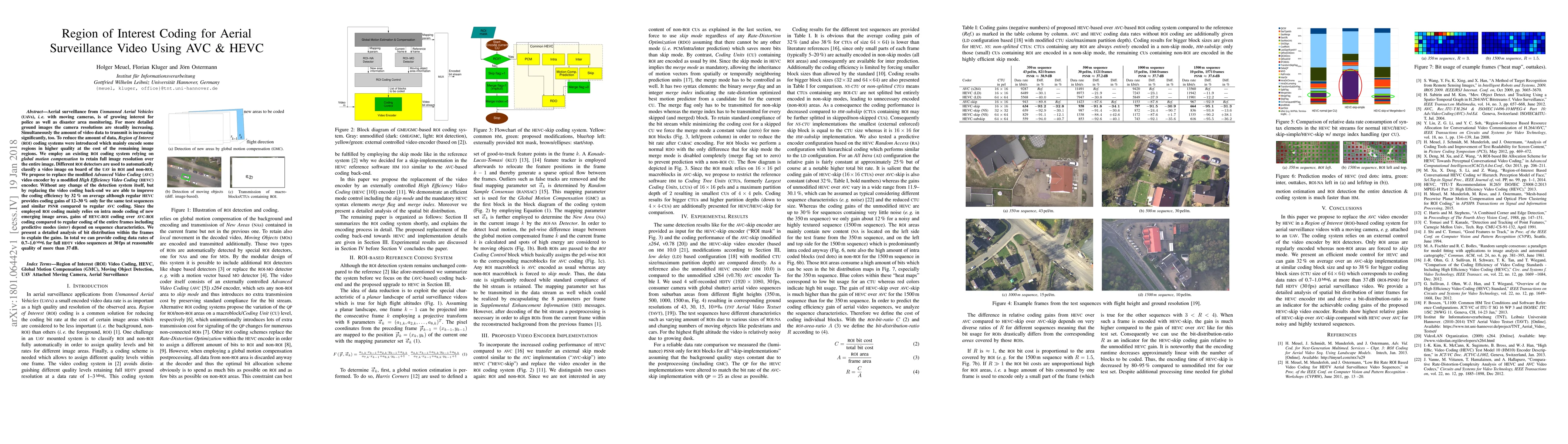 This paper proposes using High Efficiency Video Coding (HEVC) instead of Advanced Video Coding (AVC) for Region of Interest (ROI) coding in aerial surveillance videos from UAVs. The study shows that HEVC-ROI coding improves coding efficiency by 32% on average compared to AVC-ROI coding, despite HEVC typically providing only 12-30% gains over AVC for full frame coding.