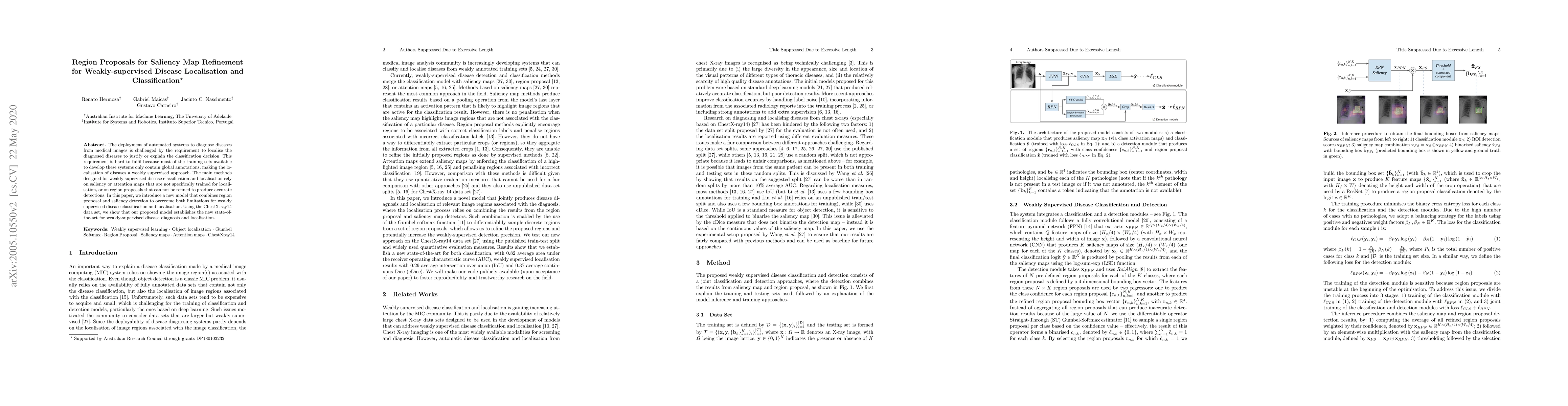 The deployment of automated systems to diagnose diseases from medical images is challenged by the requirement to localise the diagnosed diseases to justify or explain the classification decision. This requirement is hard to fulfil because most of the training sets available to develop these systems only contain global annotations, making the localisation of diseases a weakly supervised approach. The main methods designed for weakly supervised disease classification and localisation rely on saliency or attention maps that are not specifically trained for localisation, or on region proposals that can not be refined to produce accurate detections. In this paper, we introduce a new model that combines region proposal and saliency detection to overcome both limitations for weakly supervised disease classification and localisation. Using the ChestX-ray14 data set, we show that our proposed model establishes the new state-of-the-art for weakly-supervised disease diagnosis and localisation.