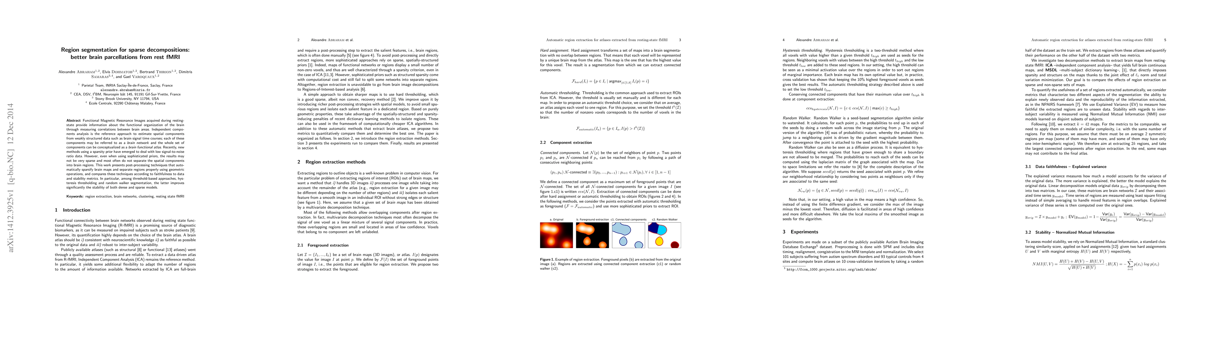 Functional Magnetic Resonance Images acquired during resting-state provide information about the functional organization of the brain through measuring correlations between brain areas. Independent components analysis is the reference approach to estimate spatial components from weakly structured data such as brain signal time courses; each of these components may be referred to as a brain network and the whole set of components can be conceptualized as a brain functional atlas. Recently, new methods using a sparsity prior have emerged to deal with low signal-to-noise ratio data. However, even when using sophisticated priors, the results may not be very sparse and most often do not separate the spatial components into brain regions. This work presents post-processing techniques that automatically sparsify brain maps and separate regions properly using geometric operations, and compares these techniques according to faithfulness to data and stability metrics. In particular, among threshold-based approaches, hysteresis thresholding and random walker segmentation, the latter improves significantly the stability of both dense and sparse models.