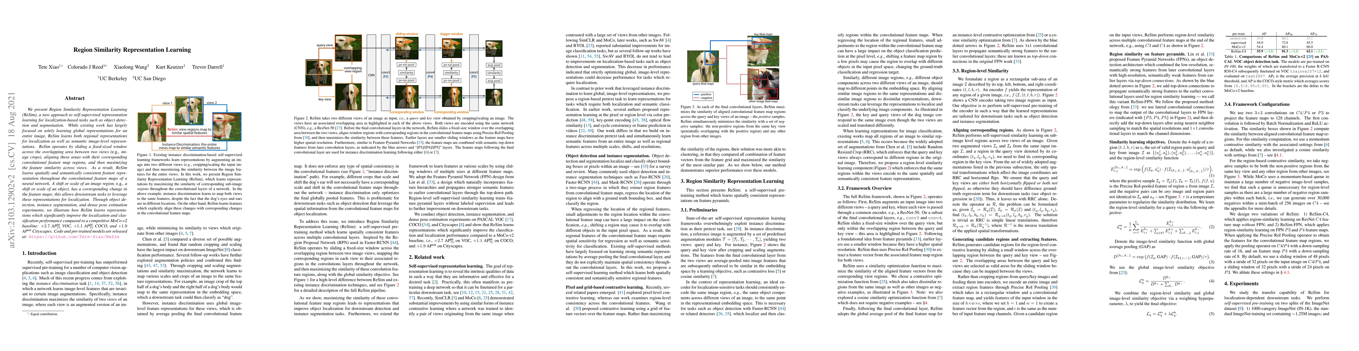 Region Similarity Representation Learning improves object detection and segmentation by learning spatially consistent feature representations from overlapping image regions.