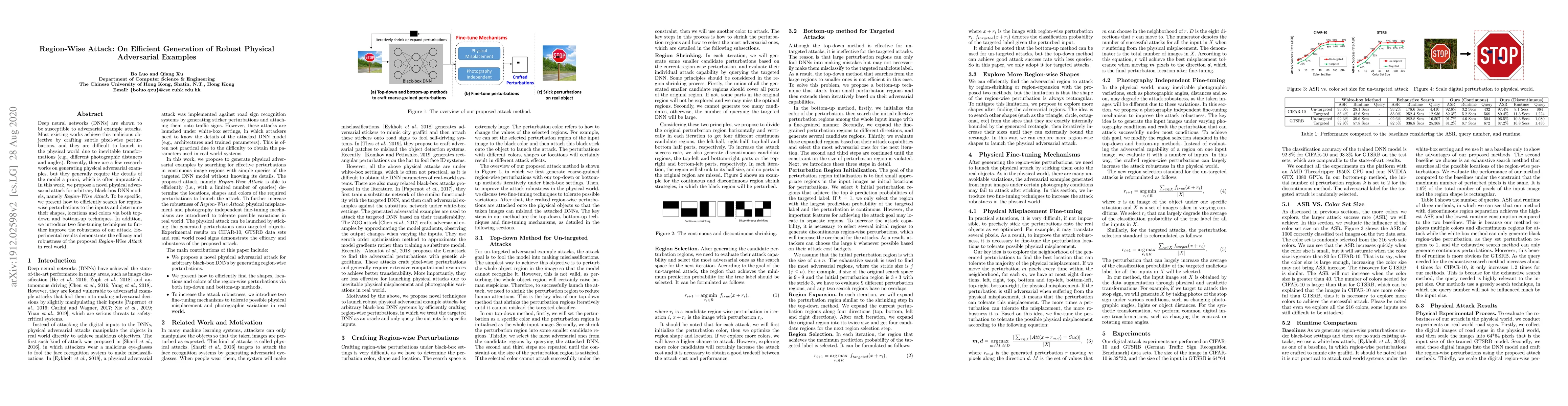 This paper proposes a novel Region-Wise Attack method for generating robust physical adversarial examples against black-box deep neural networks, utilizing regionwise perturbations and employing top-down and bottom-up techniques to determine their shapes and locations. The method demonstrates effectiveness and robustness in real-world scenarios.