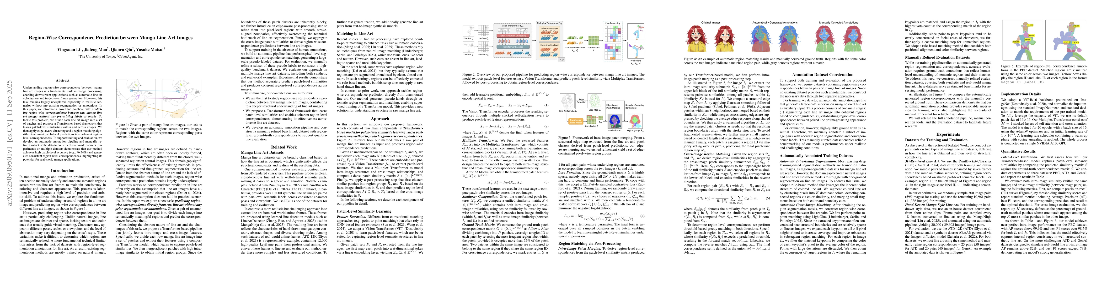 Understanding region-wise correspondence between manga line art images is a fundamental task in manga processing, enabling downstream applications such as automatic line art colorization and in-between frame generation. However, this task remains largely unexplored, especially in realistic scenarios without pre-existing segmentation or annotations. In this paper, we introduce a novel and practical task: predicting region-wise correspondence between raw manga line art images without any pre-existing labels or masks. To tackle this problem, we divide each line art image into a set of patches and propose a Transformer-based framework that learns patch-level similarities within and across images. We then apply edge-aware clustering and a region matching algorithm to convert patch-level predictions into coherent region-level correspondences. To support training and evaluation, we develop an automatic annotation pipeline and manually refine a subset of the data to construct benchmark datasets. Experiments on multiple datasets demonstrate that our method achieves high patch-level accuracy (e.g., 96.34%) and generates consistent region-level correspondences, highlighting its potential for real-world manga applications.