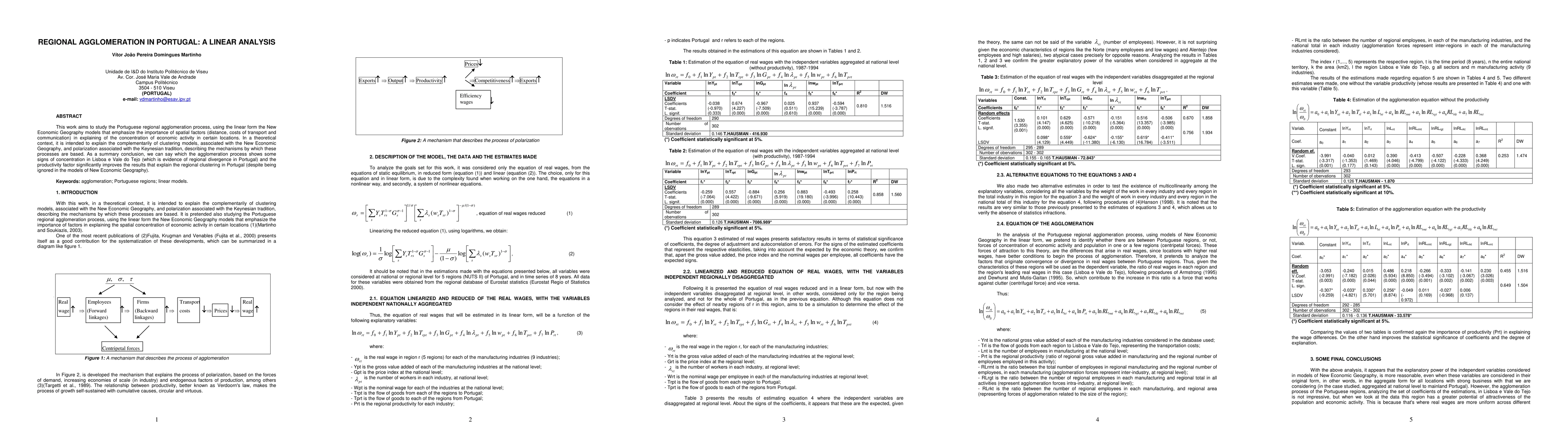 This paper analyzes Portugal's regional agglomeration using linear New Economic Geography models, highlighting the role of spatial factors in economic concentration. It finds evidence of regional divergence in the Lisboa e Vale do Tejo area and emphasizes the productivity factor's importance in explaining regional clustering.