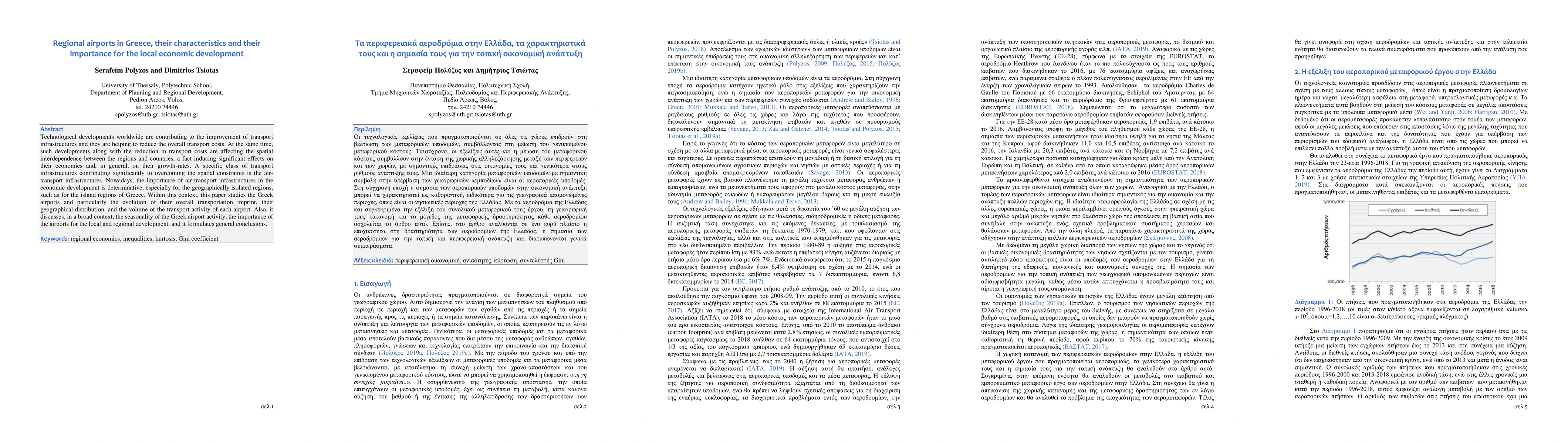 This paper examines the characteristics and economic significance of regional airports in Greece, focusing on their role in local and regional development amidst technological advancements in transport infrastructure. It analyzes the geographical distribution, transport activity volume, and seasonal patterns of Greek airports, concluding their crucial impact on economic growth in isolated regions.