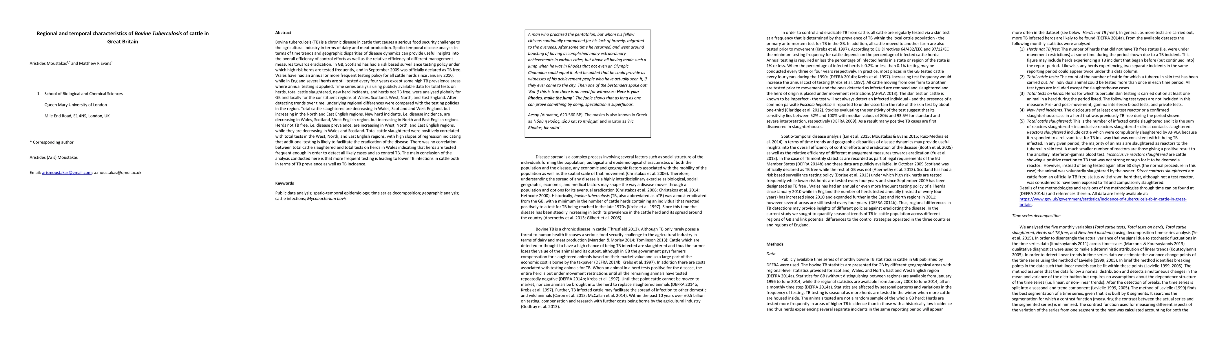This research investigates the regional and temporal trends of bovine tuberculosis in Great Britain, finding that more frequent testing correlates with lower TB incidence and prevalence, particularly in Wales and Scotland where rigorous testing policies are implemented. Regional differences highlight the effectiveness of intensive surveillance in controlling the disease.