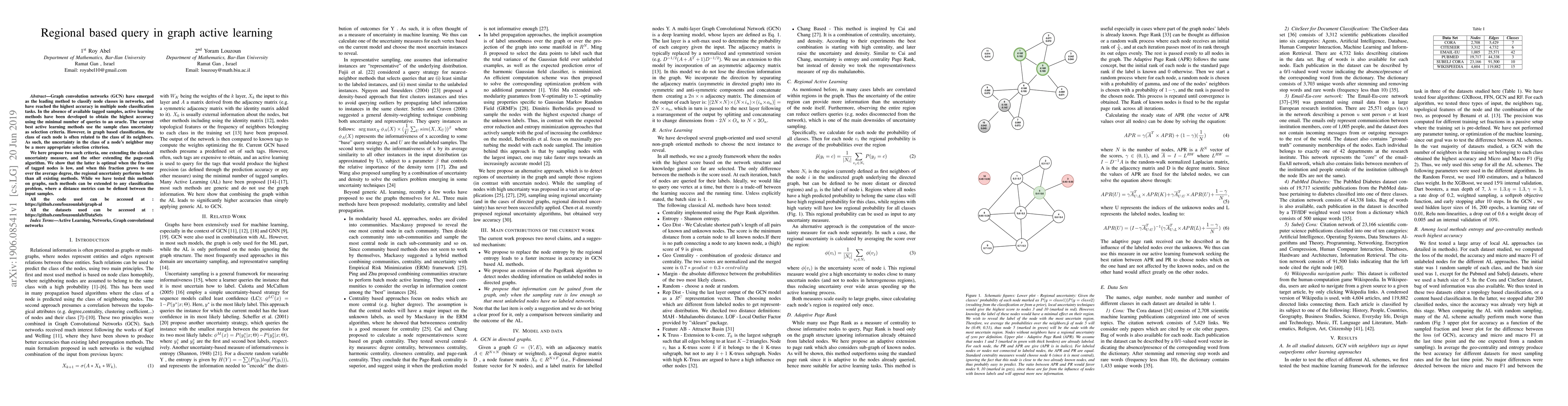 Graph convolution networks (GCN) have emerged as the leading method to classify node classes in networks, and have reached the highest accuracy in multiple node classification tasks. In the absence of available tagged samples, active learning methods have been developed to obtain the highest accuracy using the minimal number of queries to an oracle. The current best active learning methods use the sample class uncertainty as selection criteria. However, in graph based classification, the class of each node is often related to the class of its neighbors. As such, the uncertainty in the class of a node's neighbor may be a more appropriate selection criterion. We here propose two such criteria, one extending the classical uncertainty measure, and the other extending the page-rank algorithm. We show that the latter is optimal when the fraction of tagged nodes is low, and when this fraction grows to one over the average degree, the regional uncertainty performs better than all existing methods. While we have tested this methods on graphs, such methods can be extended to any classification problem, where a distance metrics can be defined between the input samples. All the code used can be accessed at : https://github.com/louzounlab/graph-al All the datasets used can be accessed at : https://github.com/louzounlab/DataSets