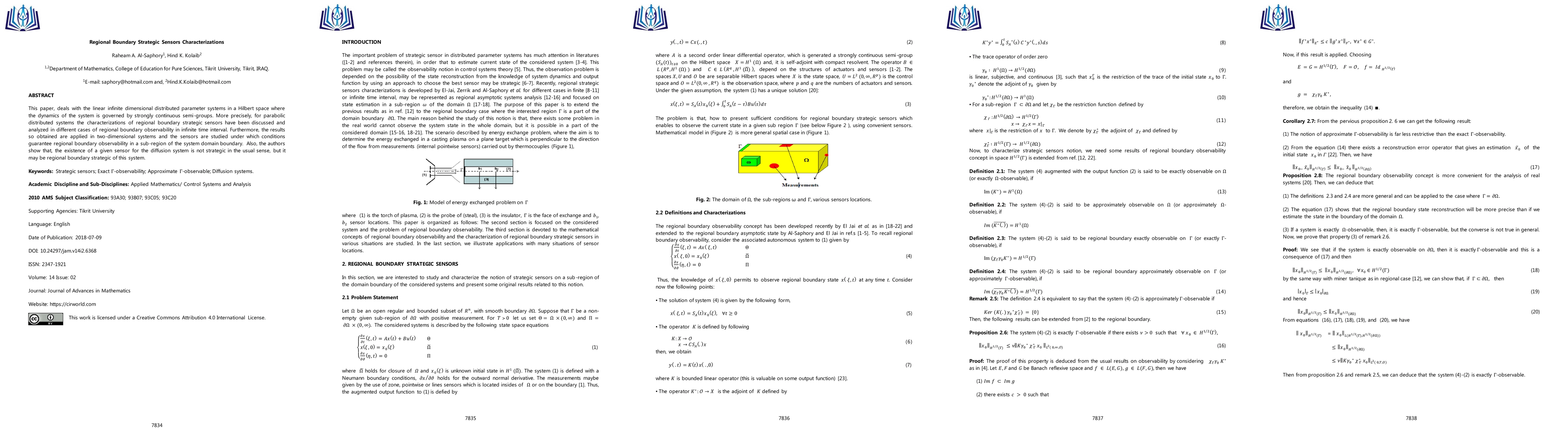 This paper, deals with the linear infinite dimensional distributed parameter systems in a Hilbert space where the dynamics of the system is governed by strongly continuous semi-groups. More precisely, for parabolic distributed systems the characterizations of regional boundary strategic sensors have been discussed and analyzed in different cases of regional boundary observability in infinite time interval. Furthermore, the results so obtained are applied in two-dimensional systems and the sensors are studied under which conditions guarantee regional boundary observability in a sub-region of the system domain boundary. Also, the authors show that, the existence of a given sensor for the diffusion system is not strategic in the usual sense, but it may be regional boundary strategic of this system.