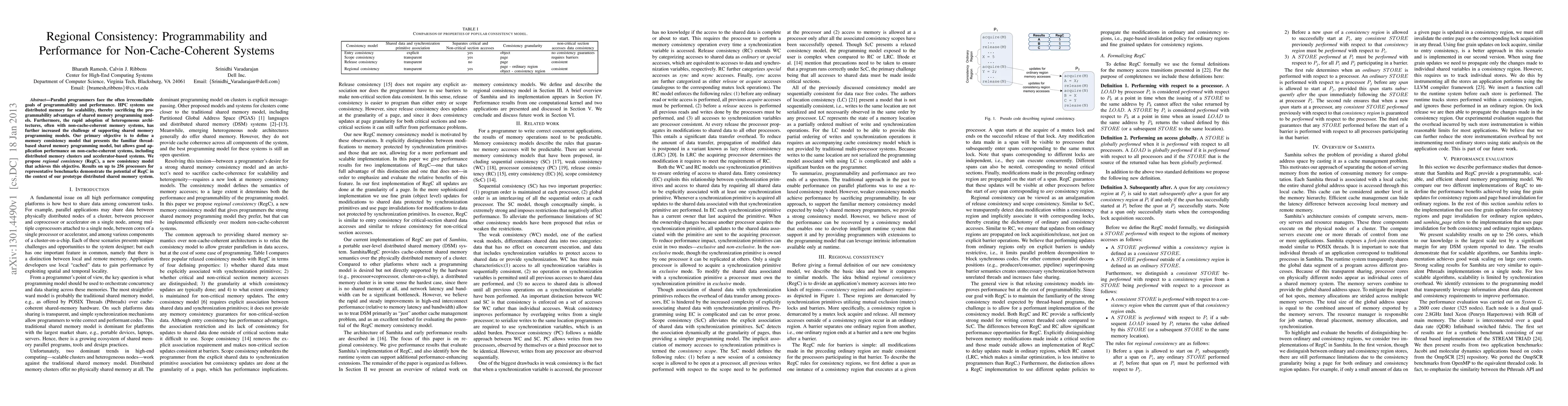 This paper proposes regional consistency (RegC) as a new memory consistency model to balance programmability and performance in non-cache-coherent, distributed memory systems. RegC aims to maintain the simplicity of shared memory programming while achieving good performance on heterogeneous architectures, as demonstrated by benchmarks on up to 256 processors.
