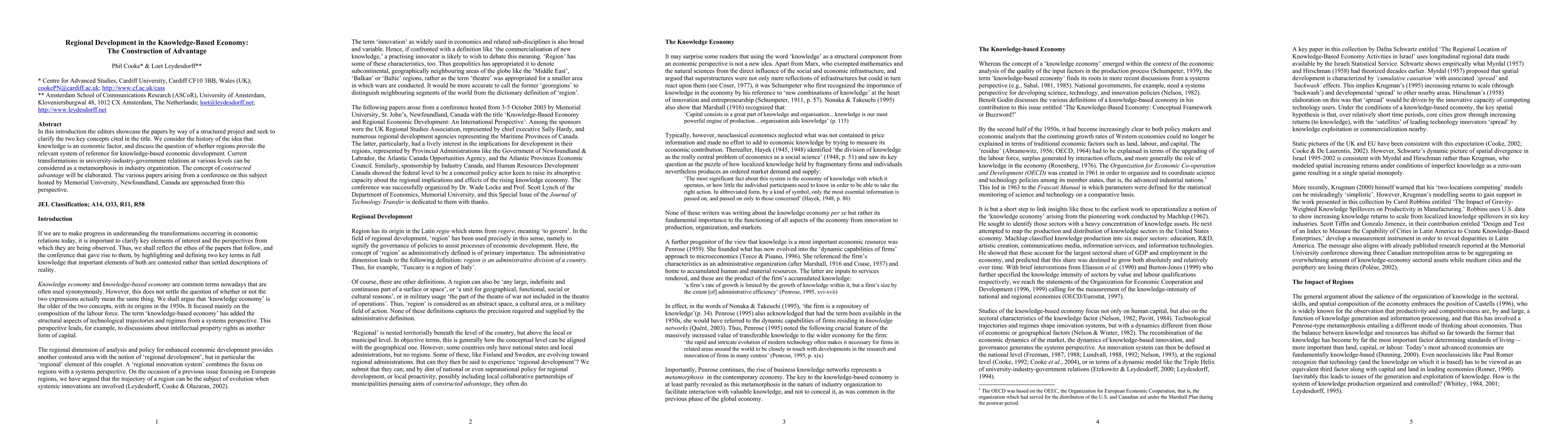 In this introduction the editors showcase the papers by way of a structured project and seek to clarify the two key concepts cited in the title. We consider the history of the idea that knowledge is an economic factor, and discuss the question of whether regions provide the relevant system of reference for knowledge-based economic development. Current transformations in university-industry-government relations at various levels can be considered as a metamorphosis in industry organization. The concept of constructed advantage will be elaborated. The various papers arising from a conference on this subject hosted by Memorial University, Newfoundland, Canada are approached from this perspective.