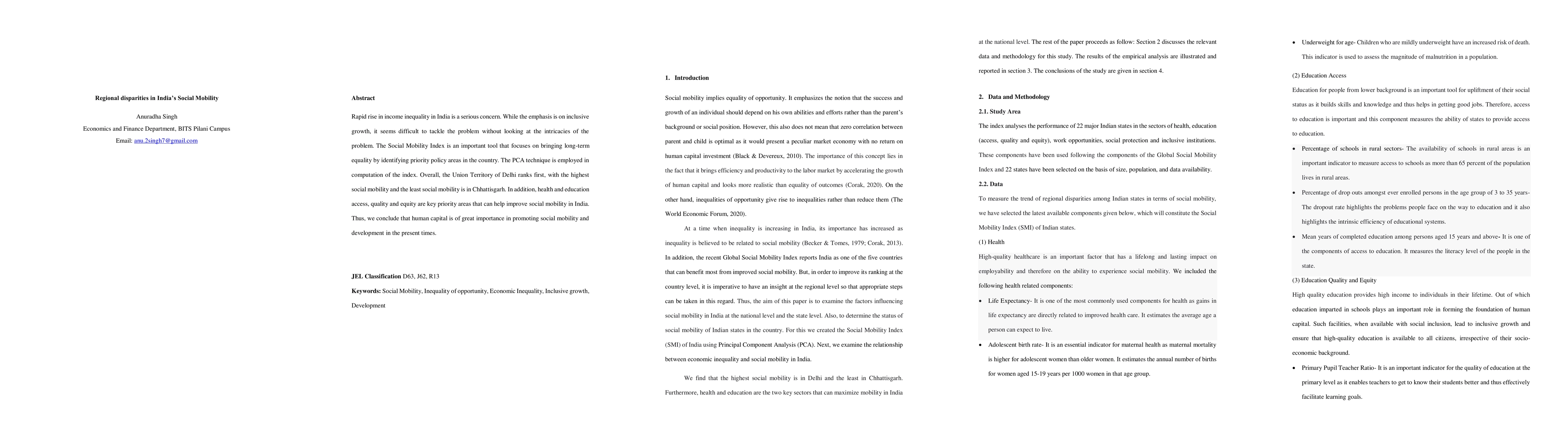 This paper examines regional disparities in India's social mobility, highlighting income inequality and the importance of the Social Mobility Index. Delhi shows the highest social mobility, while Chhattisgarh has the least, emphasizing the need for better health and education to improve social mobility and human capital development.