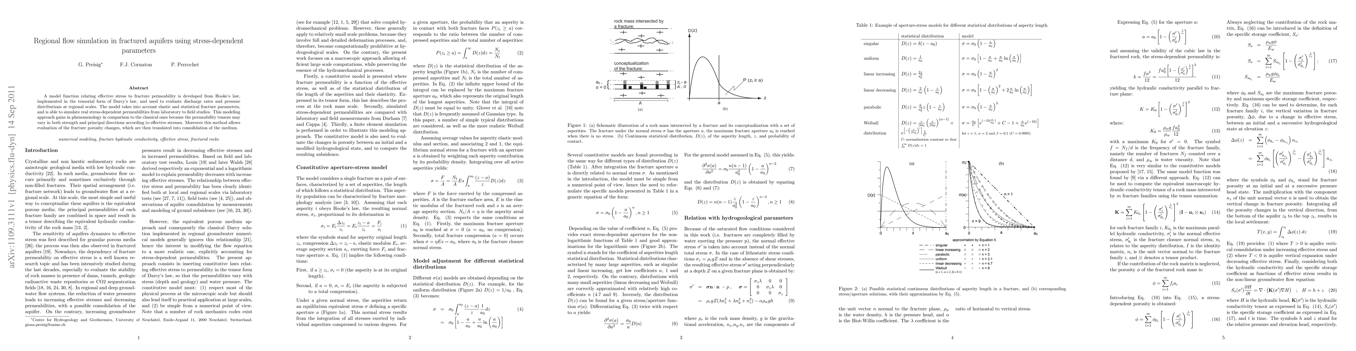 A model function relating effective stress to fracture permeability is developed from Hooke's law, implemented in the tensorial form of Darcy's law, and used to evaluate discharge rates and pressure distributions at regional scales. The model takes into account elastic and statistical fracture parameters, and is able to simulate real stress-dependent permeabilities from laboratory to field studies. This modeling approach gains in phenomenology in comparison to the classical ones because the permeability tensors may vary in both strength and principal directions according to effective stresses. Moreover this method allows evaluation of the fracture porosity changes, which are then translated into consolidation of the medium.