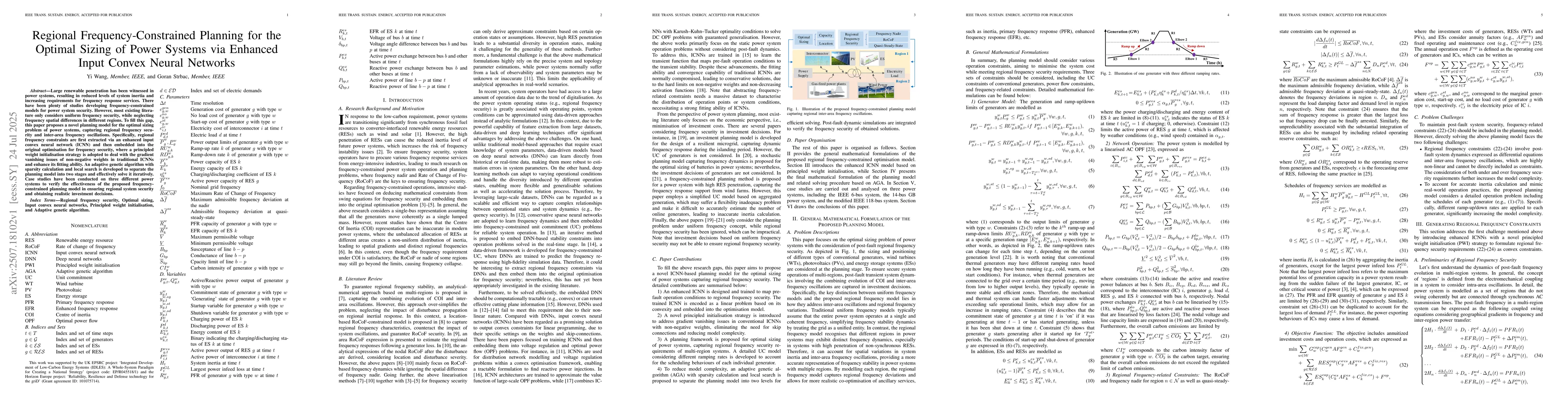 Large renewable penetration has been witnessed in power systems, resulting in reduced levels of system inertia and increasing requirements for frequency response services. There have been plenty of studies developing frequency-constrained models for power system security. However, most existing literature only considers uniform frequency security, while neglecting frequency spatial differences in different regions. To fill this gap, this paper proposes a novel planning model for the optimal sizing problem of power systems, capturing regional frequency security and inter-area frequency oscillations. Specifically, regional frequency constraints are first extracted via an enhanced input convex neural network (ICNN) and then embedded into the original optimisation for frequency security, where a principled weight initialisation strategy is adopted to deal with the gradient vanishing issues of non-negative weights in traditional ICNNs and enhance its fitting ability. An adaptive genetic algorithm with sparsity calculation and local search is developed to separate the planning model into two stages and effectively solve it iteratively. Case studies have been conducted on three different power systems to verify the effectiveness of the proposed frequency-constrained planning model in ensuring regional system security and obtaining realistic investment decisions.