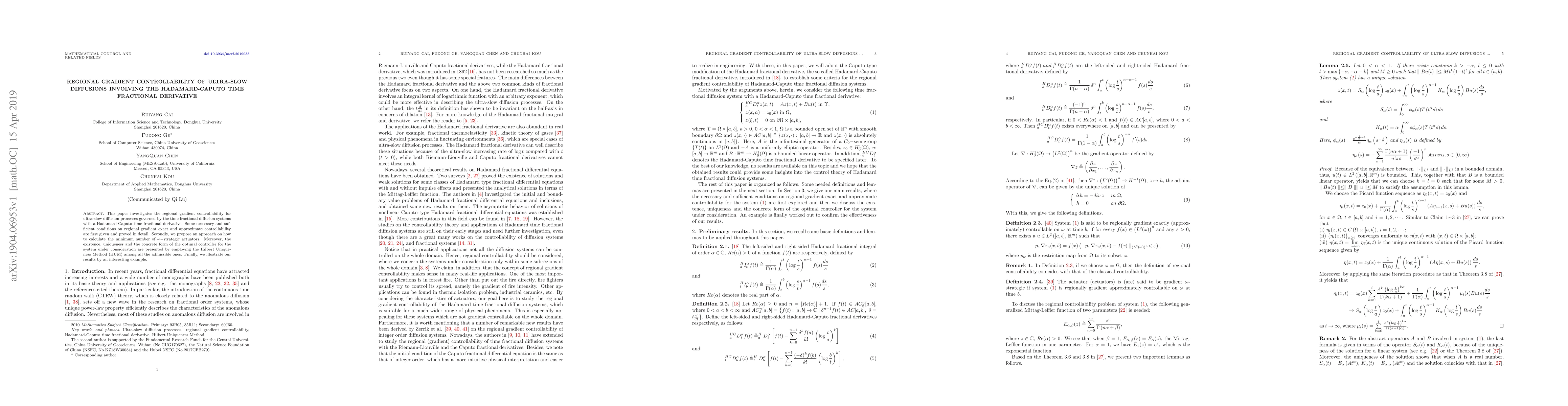 This paper explores regional gradient controllability for ultra-slow diffusions using Hadamard-Caputo time fractional derivatives, providing necessary and sufficient conditions for exact and approximate controllability. It also proposes a method to determine the minimum number of strategic actuators and presents the optimal controller using the Hilbert Uniqueness Method, illustrated by an example.