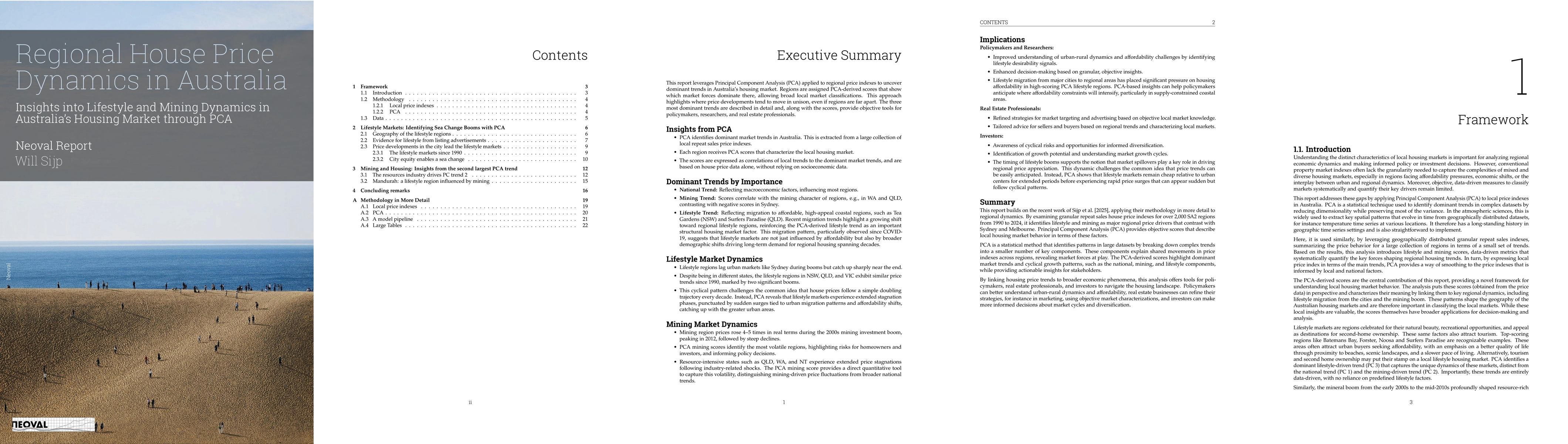 This report applies Principal Component Analysis (PCA) to regional house price indexes to uncover dominant trends in Australia's housing market. Regions are assigned PCA-derived scores that reveal which underlying market forces are most influential in each area, enabling broad classification of local housing markets. The approach highlights where price movements tend to align across regions, even those geographically distant. The three most dominant trends are described in detail and, together with the regional scores, provide objective tools for policymakers, researchers, and real estate professionals.