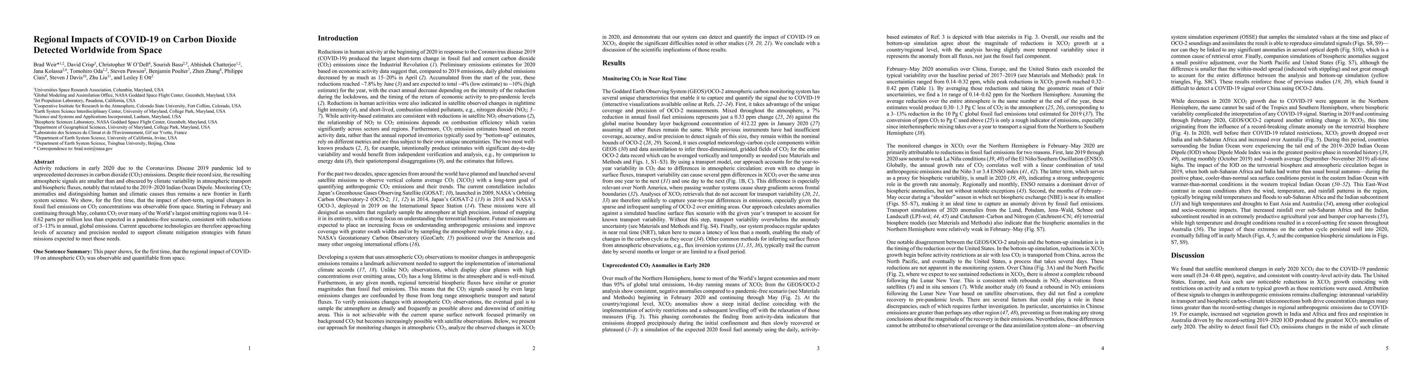This paper demonstrates that reduced fossil fuel emissions during the early COVID-19 pandemic led to observable decreases in atmospheric CO2 concentrations from space, showing reductions of 0.14 to 0.62 ppm in major emitting regions. Despite these reductions, distinguishing human-induced changes from natural variability remains challenging.