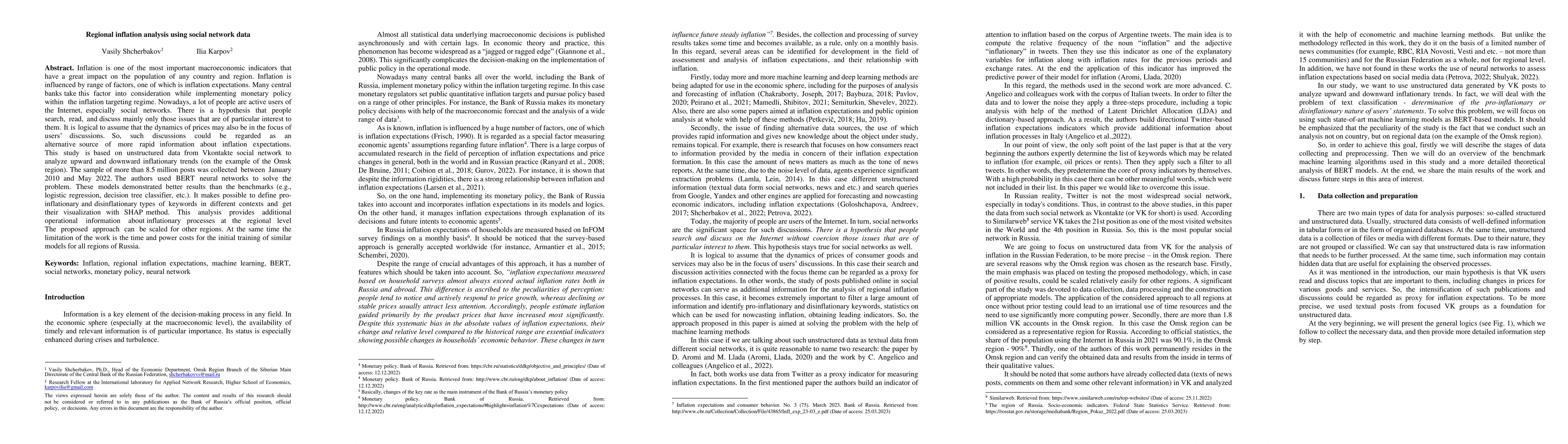 Inflation is one of the most important macroeconomic indicators that have a great impact on the population of any country and region. Inflation is influenced by range of factors, one of which is inflation expectations. Many central banks take this factor into consideration while implementing monetary policy within the inflation targeting regime. Nowadays, a lot of people are active users of the Internet, especially social networks. There is a hypothesis that people search, read, and discuss mainly only those issues that are of particular interest to them. It is logical to assume that the dynamics of prices may also be in the focus of user discussions. So, such discussions could be regarded as an alternative source of more rapid information about inflation expectations. This study is based on unstructured data from Vkontakte social network to analyze upward and downward inflationary trends (on the example of the Omsk region). The sample of more than 8.5 million posts was collected between January 2010 and May 2022. The authors used BERT neural networks to solve the problem. These models demonstrated better results than the benchmarks (e.g., logistic regression, decision tree classifier, etc.). It makes possible to define pro-inflationary and disinflationary types of keywords in different contexts and get their visualization with SHAP method. This analysis provides additional operational information about inflationary processes at the regional level The proposed approach can be scaled for other regions. At the same time the limitation of the work is the time and power costs for the initial training of similar models for all regions of Russia.