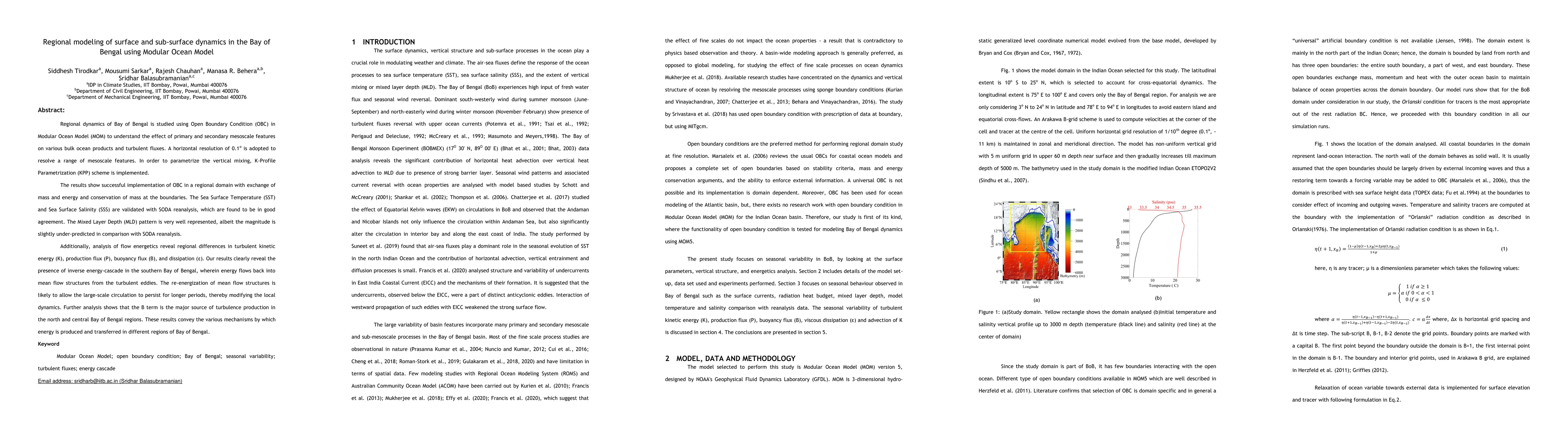 This paper uses the Modular Ocean Model to study regional dynamics in the Bay of Bengal, focusing on mesoscale features and turbulent fluxes. Results show good agreement between modeled and reanalysis data for SST and SSS, and reveal an inverse energy-cascade in the southern region, indicating mechanisms for energy transfer and persistence of large-scale circulation.