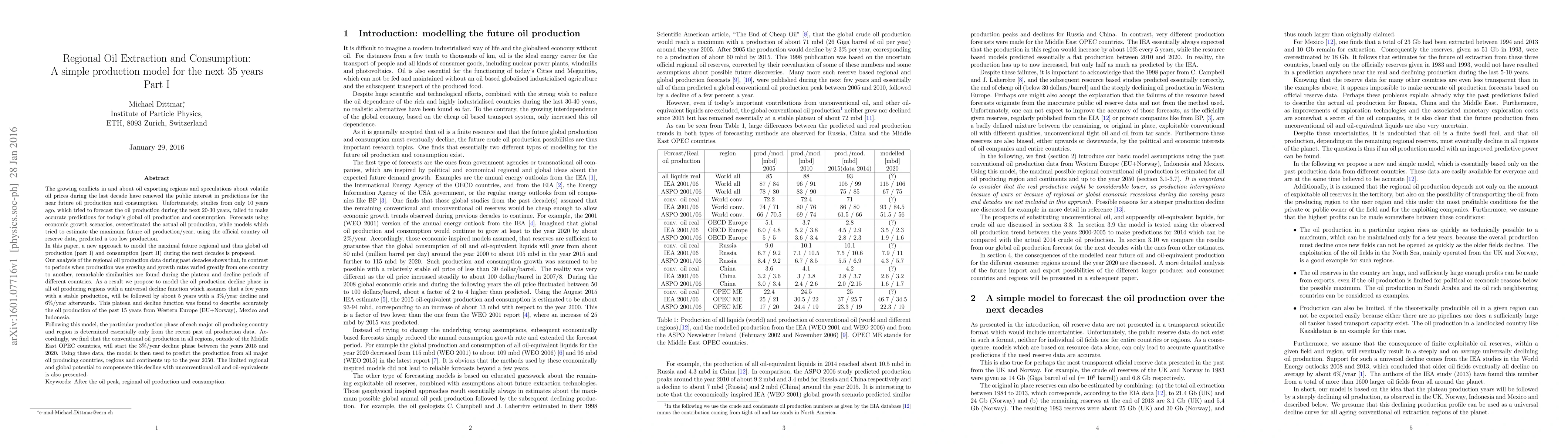 This paper proposes a new model to forecast regional and global oil production and consumption over the next 35 years, based on historical production data and identifying similarities in plateau and decline phases across countries. The model predicts oil production up to 2050 and highlights the limited potential of unconventional oil sources to offset declines.