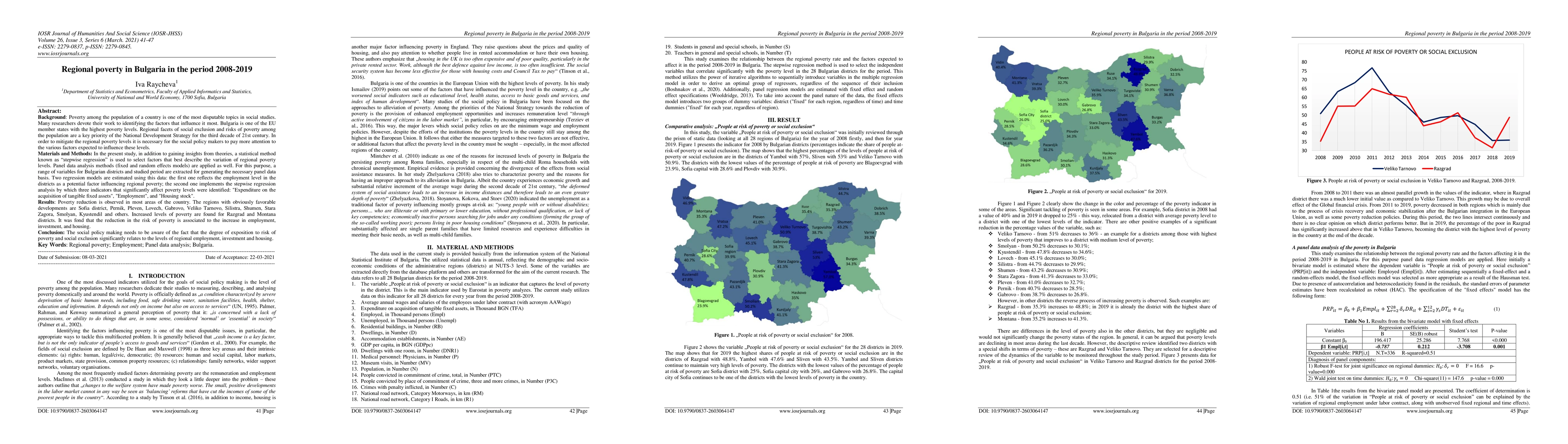 Background: Poverty among the population of a country is one of the most disputable topics in social studies. Many researchers devote their work to identifying the factors that influence it most. Bulgaria is one of the EU member states with the highest poverty levels. Regional facets of social exclusion and risks of poverty among the population are a key priority of the National Development Strategy for the third decade of 21st century. In order to mitigate the regional poverty levels it is necessary for the social policy makers to pay more attention to the various factors expected to influence these levels. Results: Poverty reduction is observed in most areas of the country. The regions with obviously favorable developments are Sofia district, Pernik, Pleven, Lovech, Gabrovo, Veliko Tarnovo, Silistra, Shumen, Stara Zagora, Smolyan, Kyustendil and others. Increased levels of poverty are found for Razgrad and Montana districts. It was fond that the reduction in the risk of poverty is associated to the increase in employment, investment, and housing. Conclusion: The social policy making needs to be aware of the fact that the degree of exposition to risk of poverty and social exclusion significantly relates to the levels of regional employment, investment and housing.